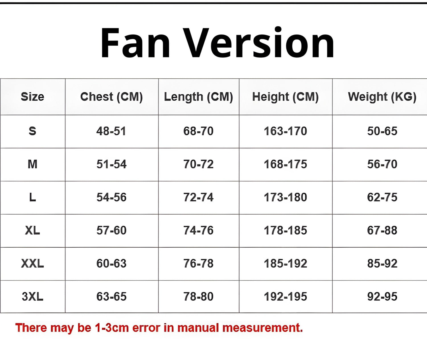 تتميز قمصان Fan Version بقصّة عادية ومريحة لراحة يومية. مقاساتها مطابقة للمقاسات، ولكن إذا كنت تفضل التصميم الفضفاض، يمكنك دائمًا اختيار مقاس أكبر.