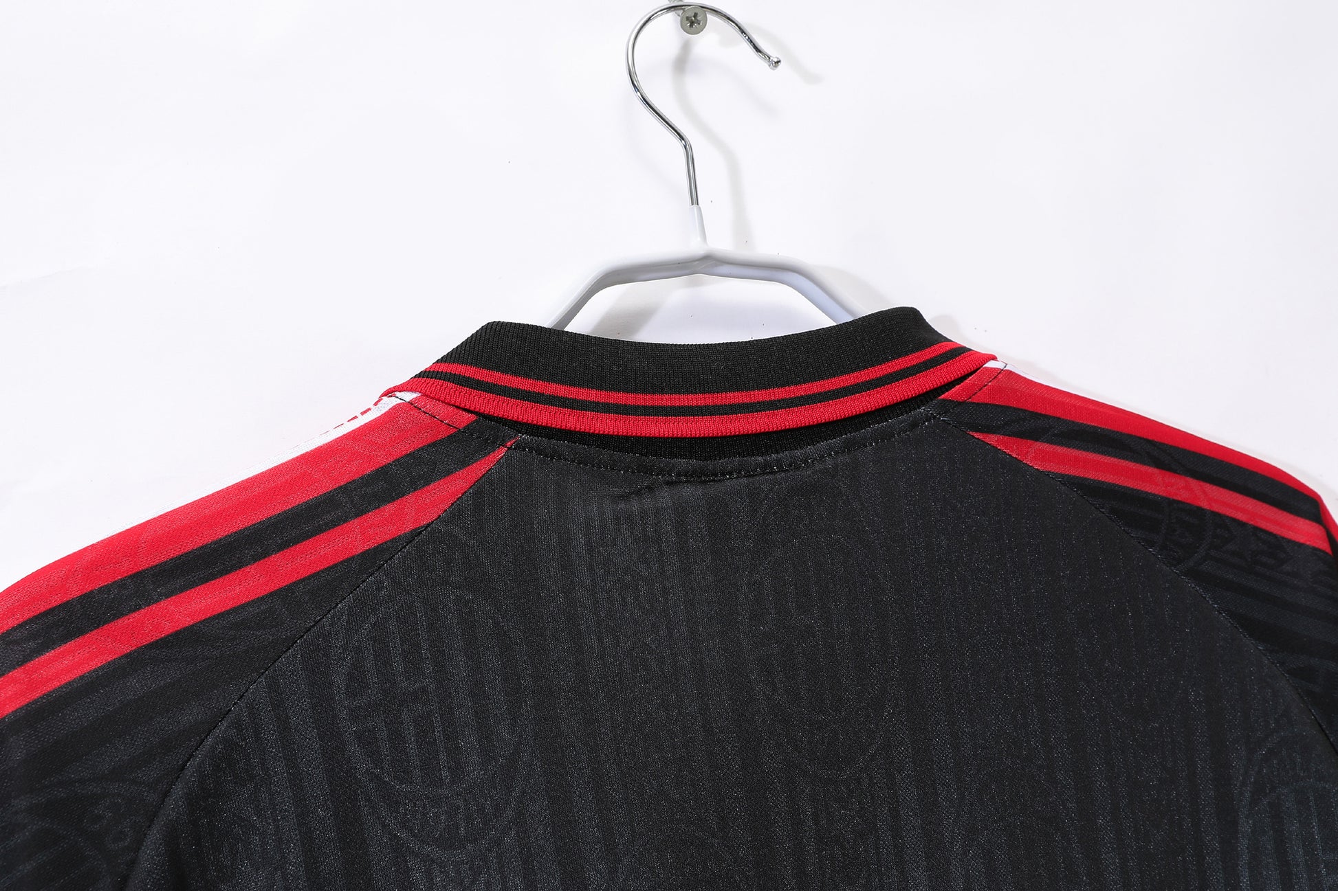 The 1997–98 AC Milan third kit, produced by Lotto, is a distinctive black jersey featuring red and white accents. This design includes a polo collar and shoulder detailing that complement the Opel sponsor logo prominently displayed across the chest. The kit was worn during a challenging season for Milan, where they finished 10th in Serie A and faced early exits in domestic and European competitions.