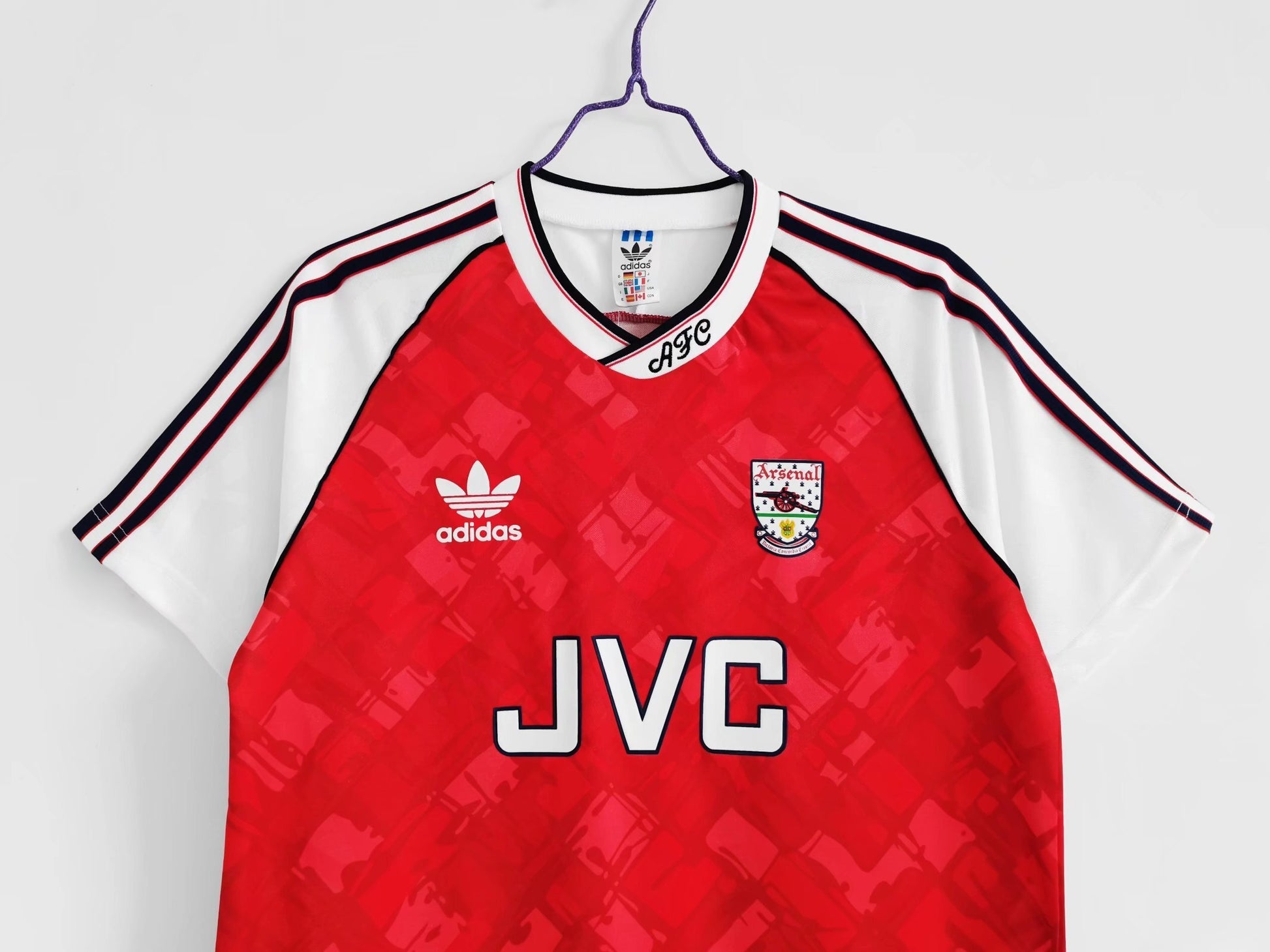 The Arsenal 1990/92 home kit, produced by Adidas, is a classic design that captures the essence of early ‘90s football fashion. The shirt features a vibrant red base with white raglan sleeves, adorned with navy blue and white stripes. A subtle tonal camouflage pattern adds texture to the fabric, giving it a distinctive look. The iconic “JVC” sponsor logo is prominently displayed across the chest, while the Adidas trefoil logo and the Arsenal crest complete the ensemble. This kit was worn during a successful period for the club, including the 1990-91 season when Arsenal clinched the First Division title with a remarkable record of 18 wins and 4 draws, losing only 2 matches. The design remains a favorite among fans and collectors, symbolizing a golden era in Arsenal’s history.