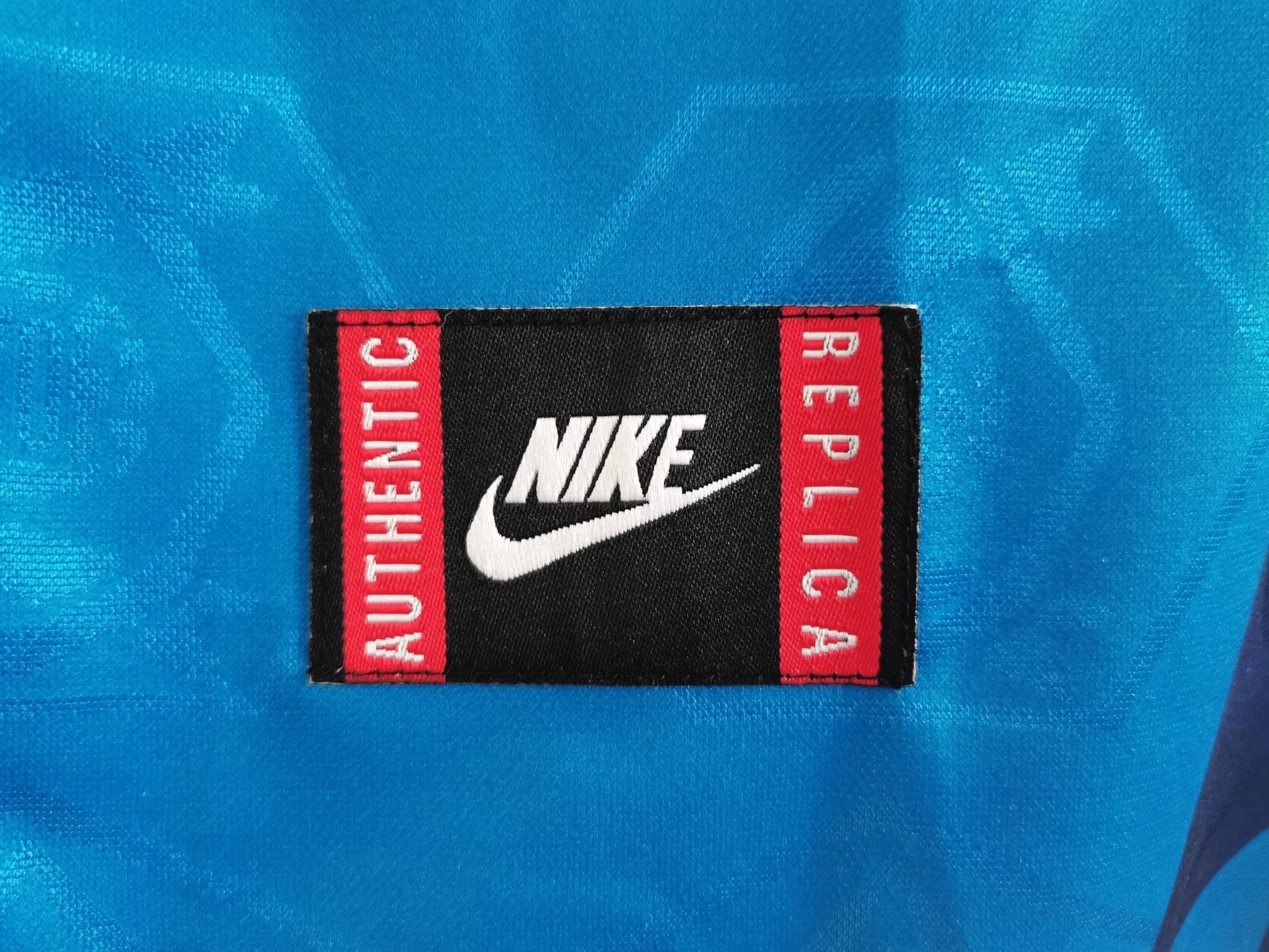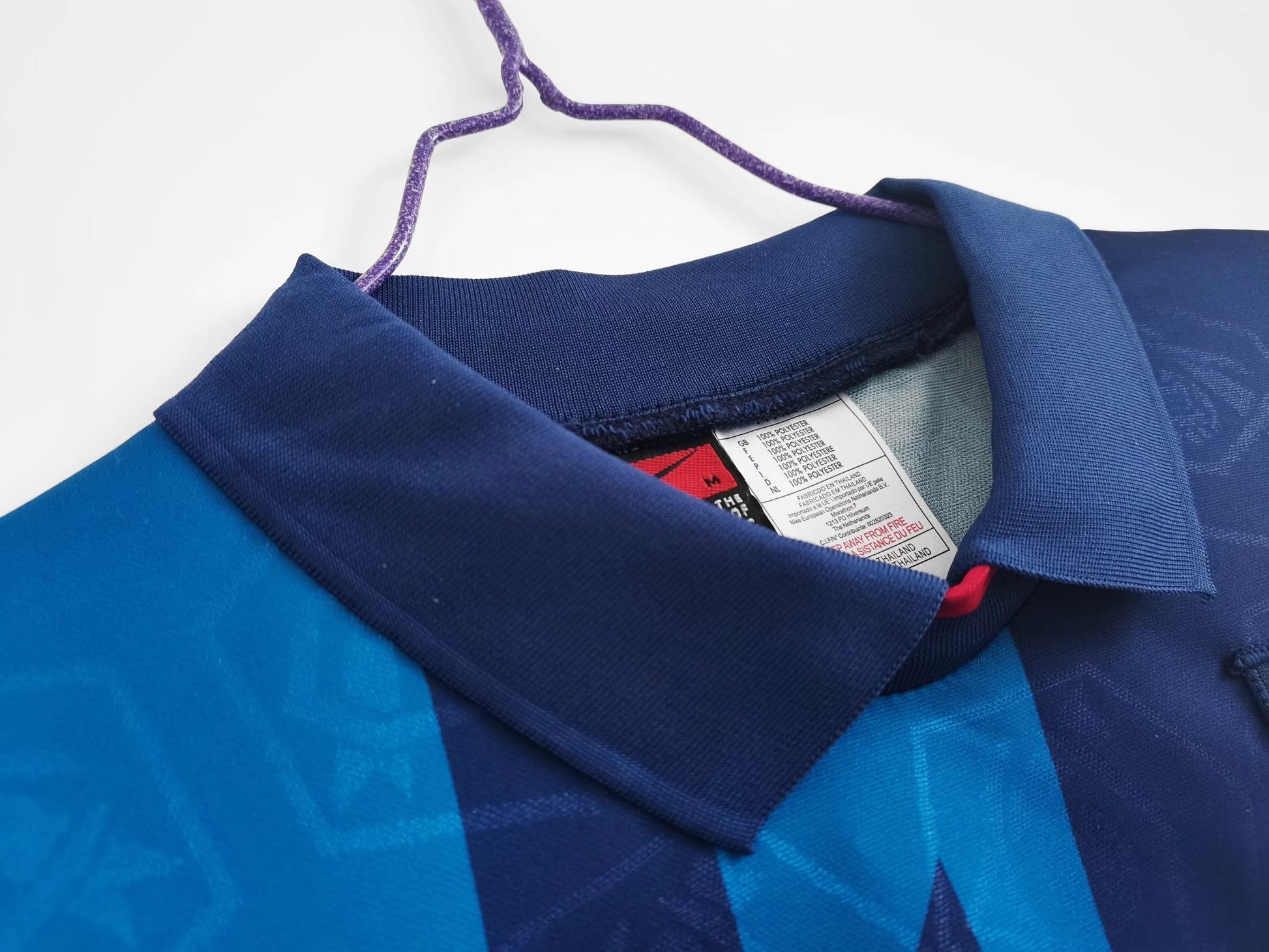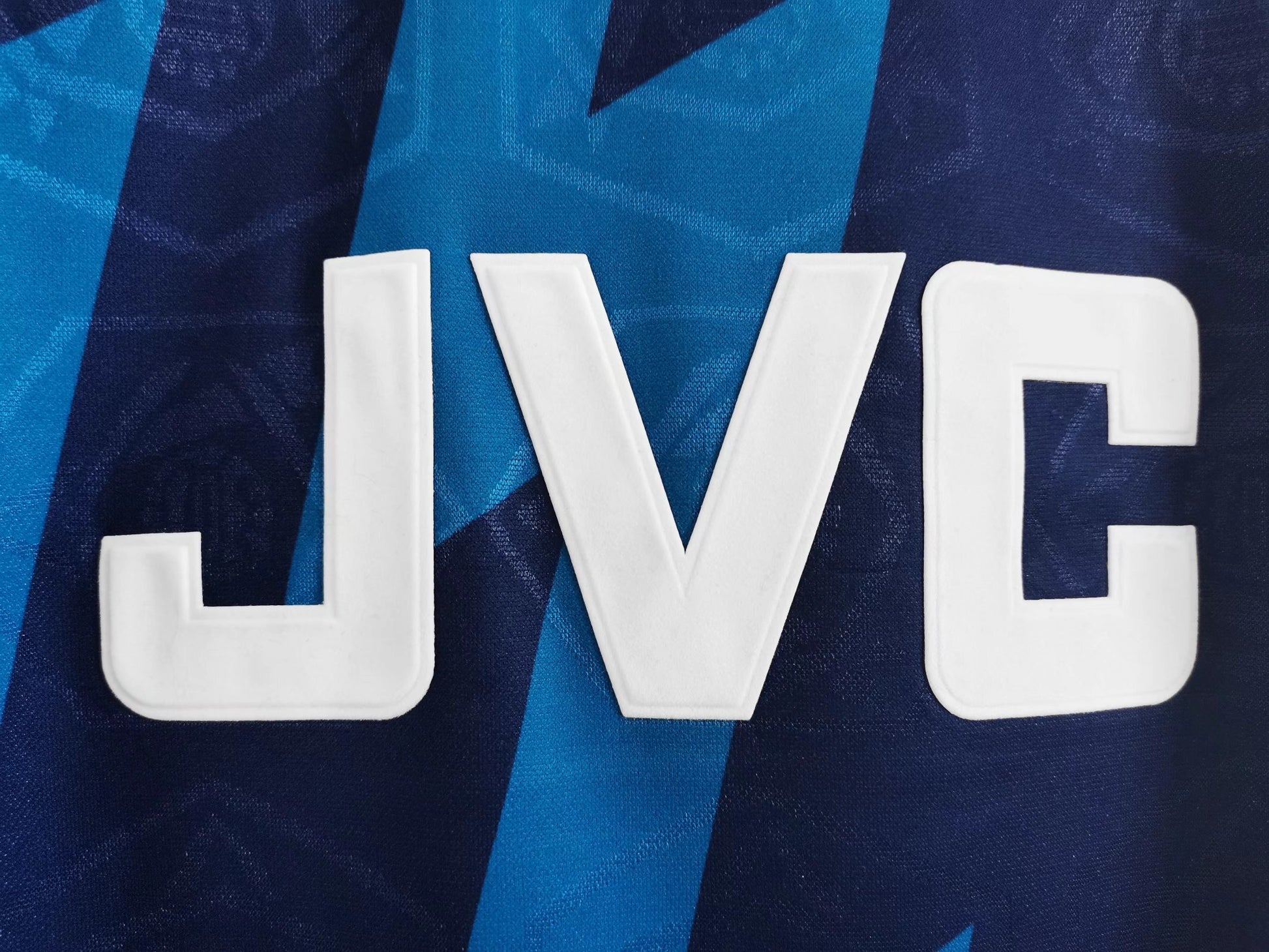 This iconic shirt, Nike’s first away kit for Arsenal, featured a bold navy base overlaid with electric light blue diagonal zig-zag patterns, evocative of lightning bolts . The design is amplified with a contrasting navy V-neck trimmed in white, sleeves echoing the bold pattern, and the traditional white JVC sponsor logo across the chest alongside the embroidered Arsenal crest . Worn by club legends such as Ian Wright, Paul Merson, Tony Adams, and David Platt during a turbulent 1994–95 season—one that saw George Graham depart midway and the team finish 12th in the Premier League—it nonetheless secured its place in history as one of Arsenal’s most audacious and beloved kits .