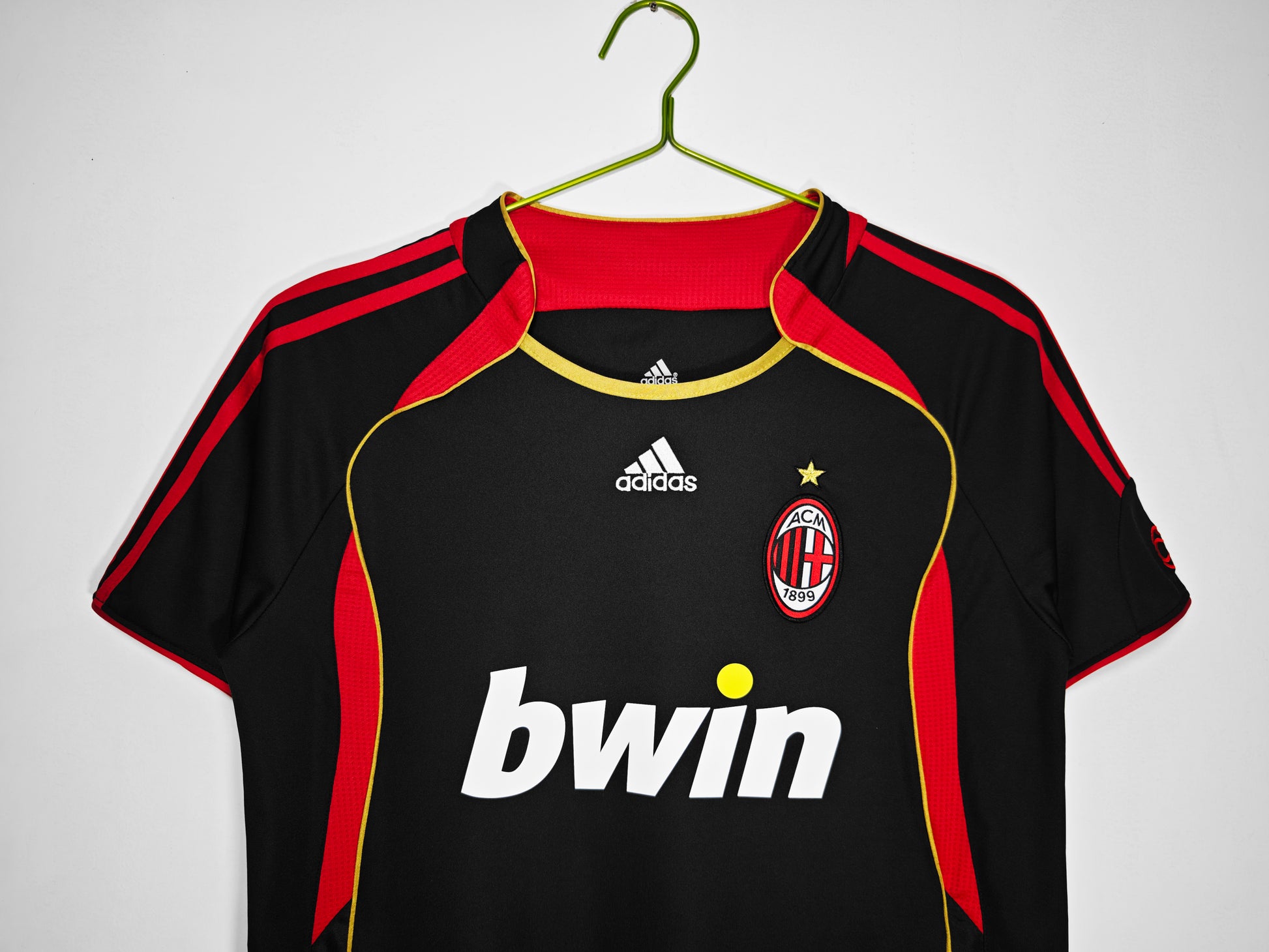AC Milan’s alternative strip that season was a striking all-black design, giving it a modern and intimidating look compared to the traditional red/black stripes or the classic all-white away. The jersey featured subtle red Adidas stripes running down the shoulders and sleeves, with the bwin sponsor logo in white across the chest for strong contrast. The collar was a simple rounded shape with thin red edging, and the sleeve cuffs carried faint red detailing to complement the overall design. Black shorts with red accents and black socks with red bands completed the sleek, unified look. This kit was mainly used in Serie A and Champions League away matches when a darker but non-striped alternative was required, adding variety to Milan’s wardrobe during their Champions League–winning season.
