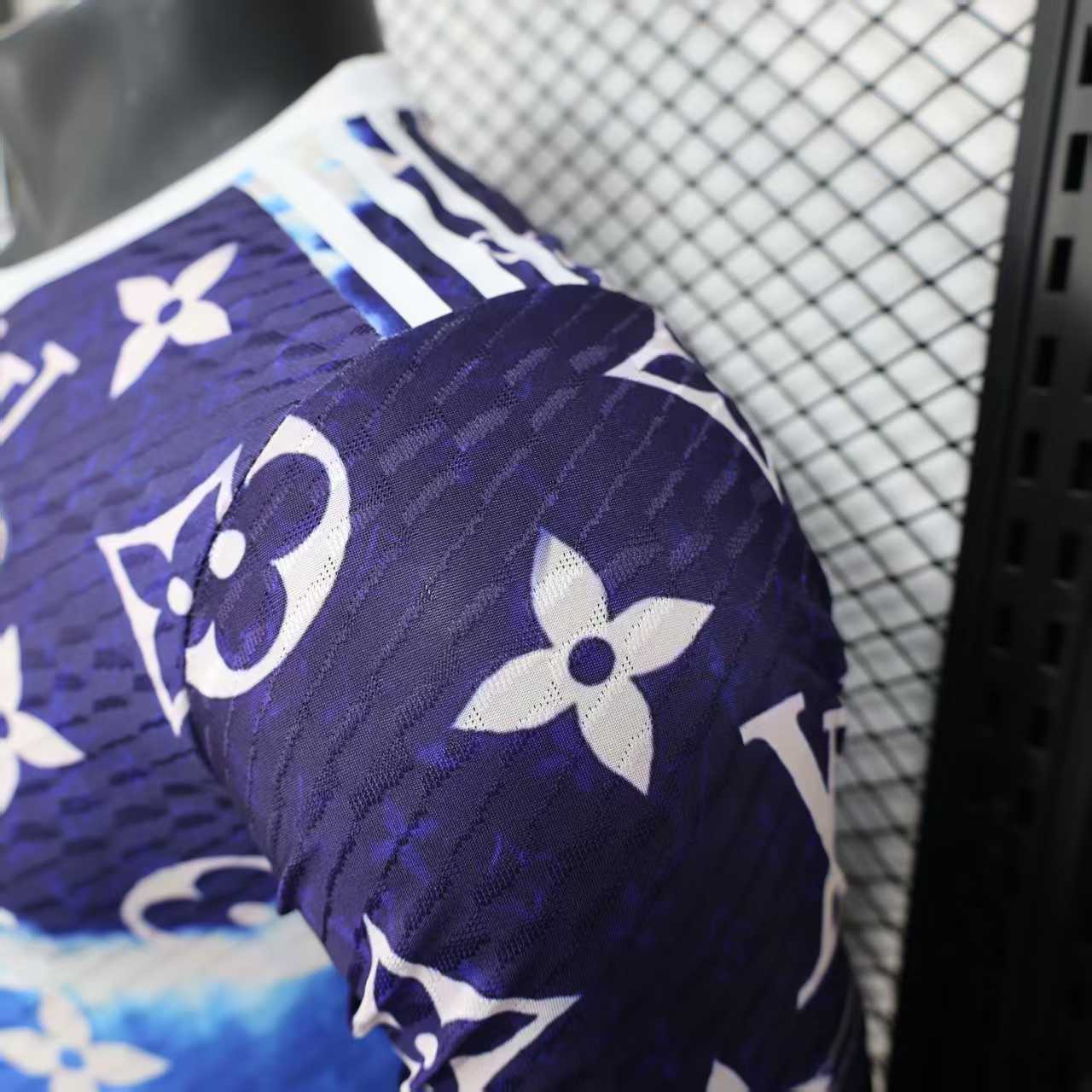 The Real Madrid x Louis Vuitton Special Edition Jersey (Purple Base with White Accents) is a stunning fusion of royal elegance and modern minimalism. The jersey features a rich deep purple base, representing prestige and power, beautifully overlaid with a subtle Louis Vuitton monogram pattern for a touch of designer sophistication. Crisp white accents outline the collar, sleeve cuffs, and side panels, creating a clean contrast that highlights Real Madrid’s classic purity and style. The embroidered club crest and Louis Vuitton logo appear in sleek white, alongside the “Fly Better” sponsor across the chest, maintaining a balanced and refined aesthetic. Made from lightweight, breathable, high-performance fabric, the jersey ensures both comfort and elegance on and off the pitch. This special edition celebrates the meeting of luxury and legacy—where Real Madrid’s royal heritage meets Louis Vuitton’s timeless artistry in flawless harmony.