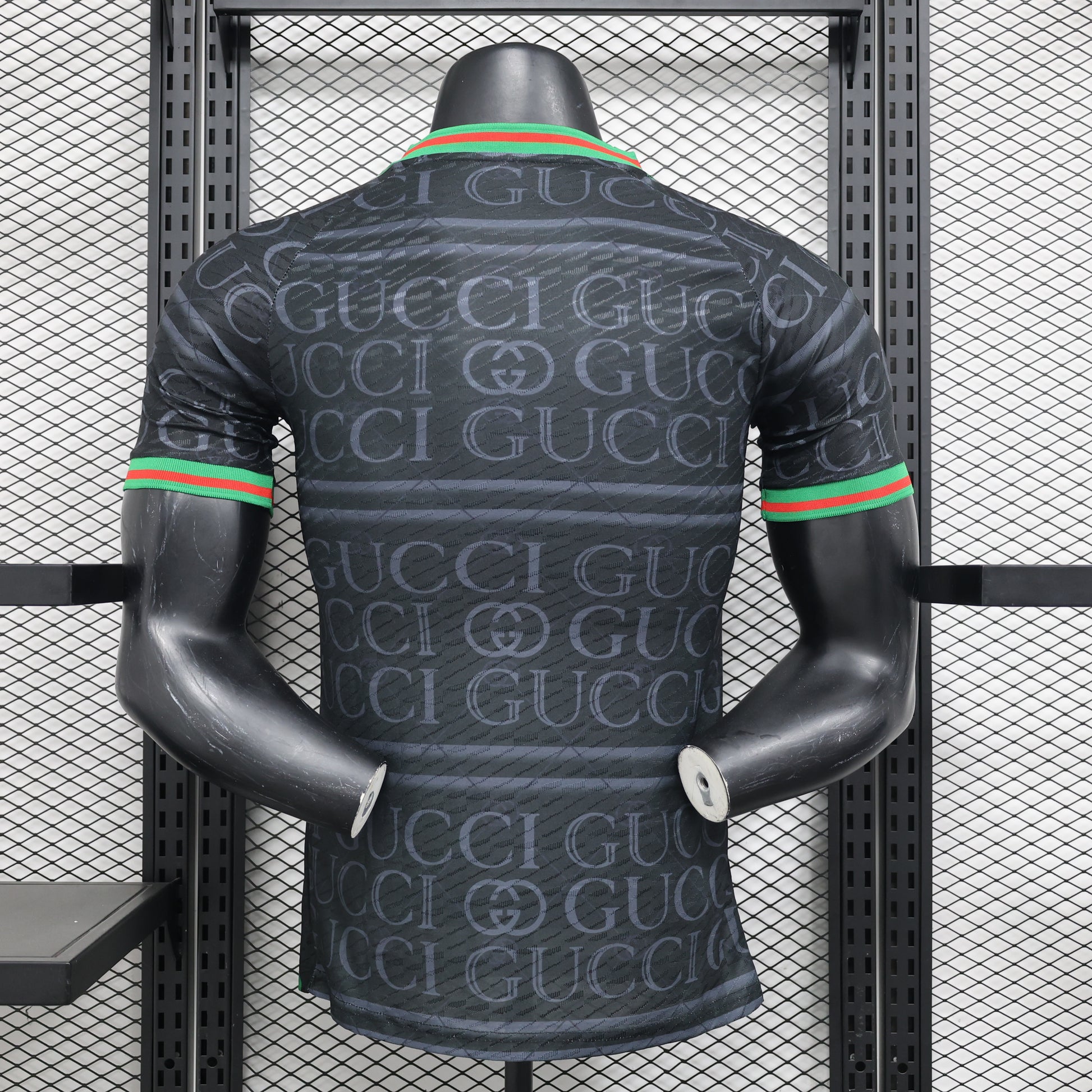 This Real Madrid special edition jersey draws inspiration from Gucci’s luxury aesthetic. The black base provides a sophisticated backdrop for the iconic red, green, and gold stripes that run through the design. It blends high fashion with football tradition, resulting in a jersey that feels exclusive and elegant—an unmistakable statement piece for both the pitch and the streets.
