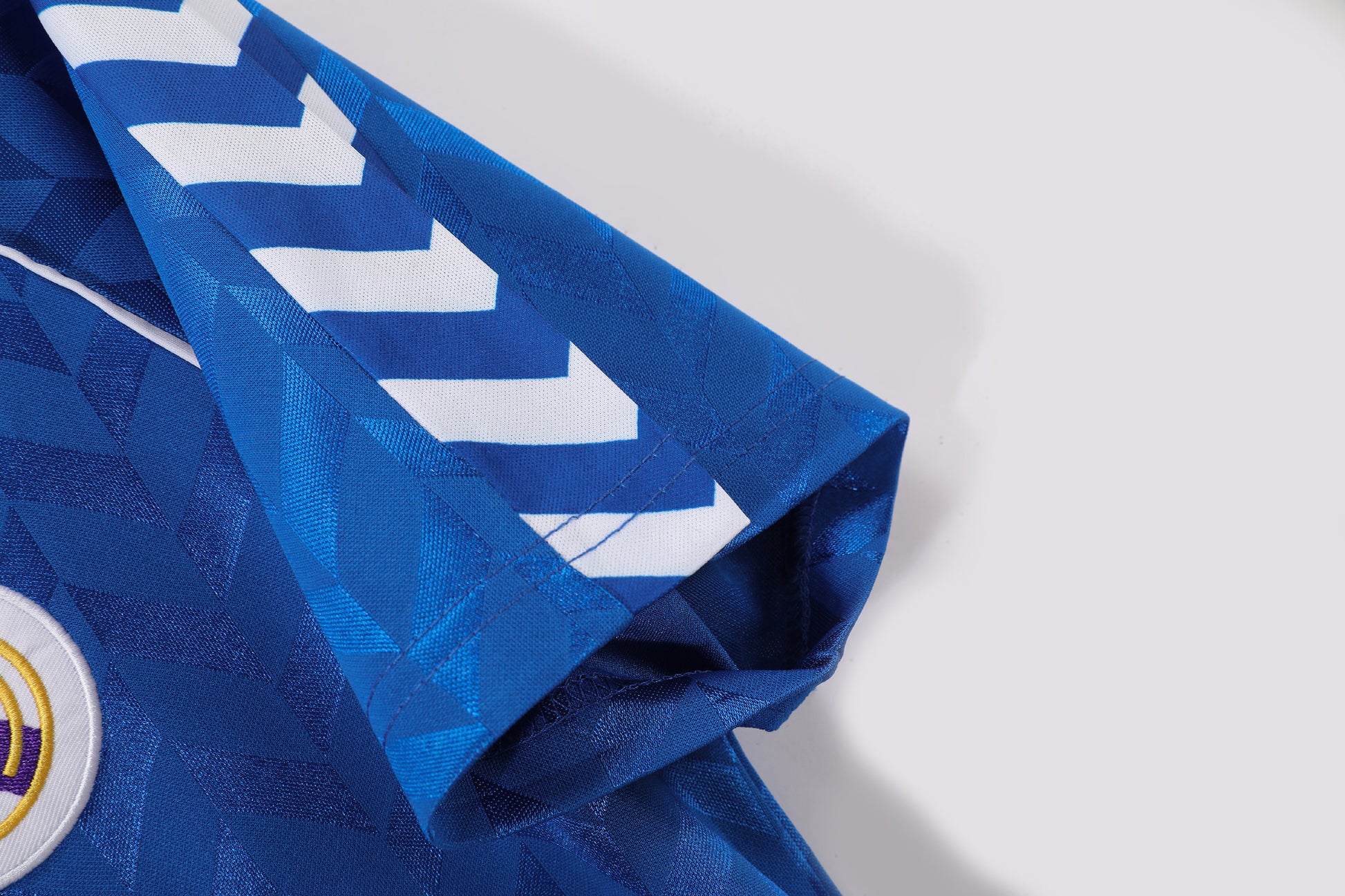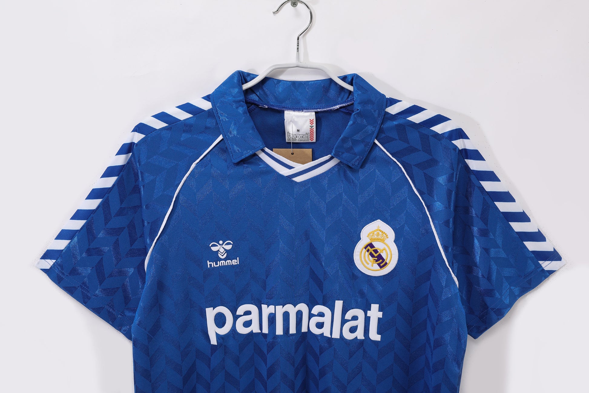 The 1986/87 Real Madrid away kit by Hummel was blue, a break from the more traditional purple tone used in previous years. The shirt carried the classic Hummel chevrons in white along the sleeves, with the Parmalat sponsor also in white on the chest, giving the kit a sharp contrast. It was matched with blue shorts and socks for a clean full-color set. During that season, Real Madrid wore this blue away strip while retaining the La Liga title with Hugo Sánchez as the league’s top scorer, as well as showcasing their dominance with players like Butragueño and Michel at their peak.
