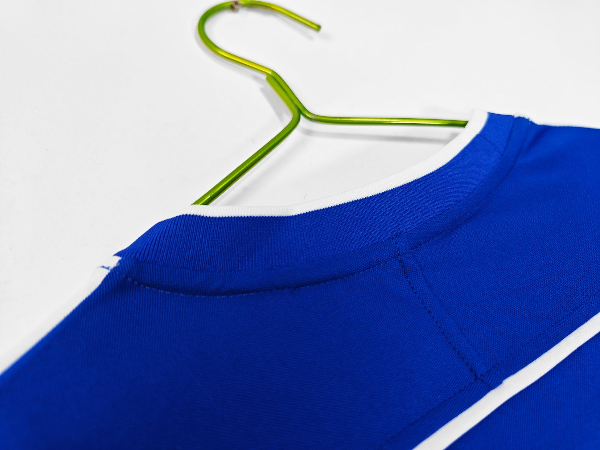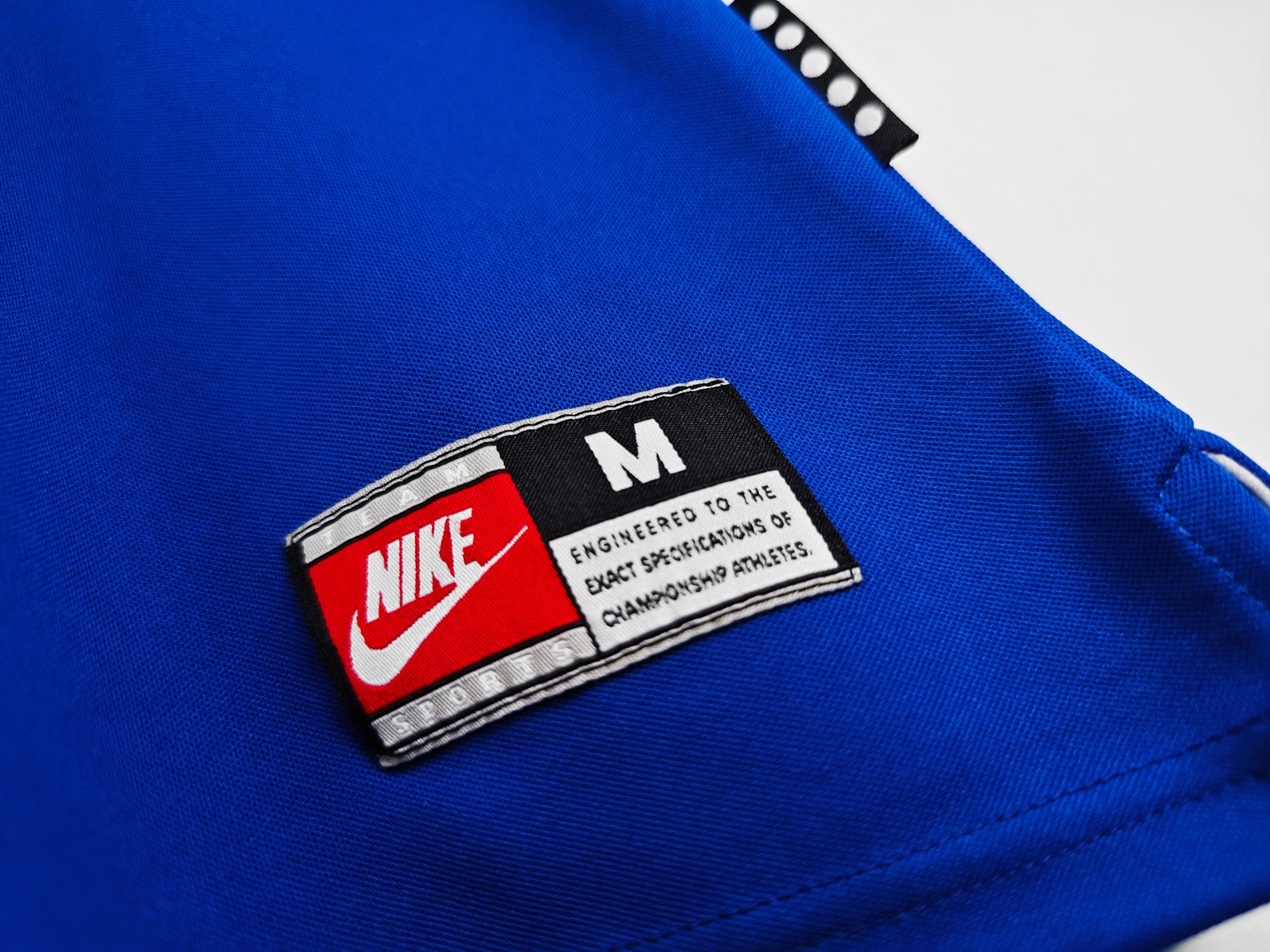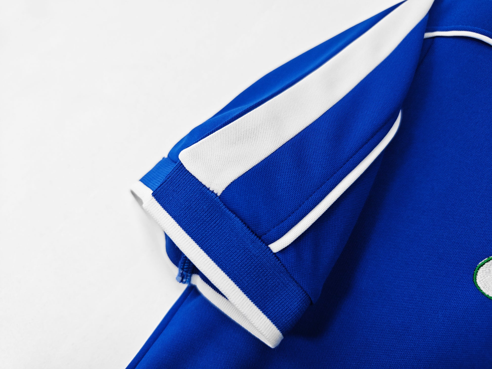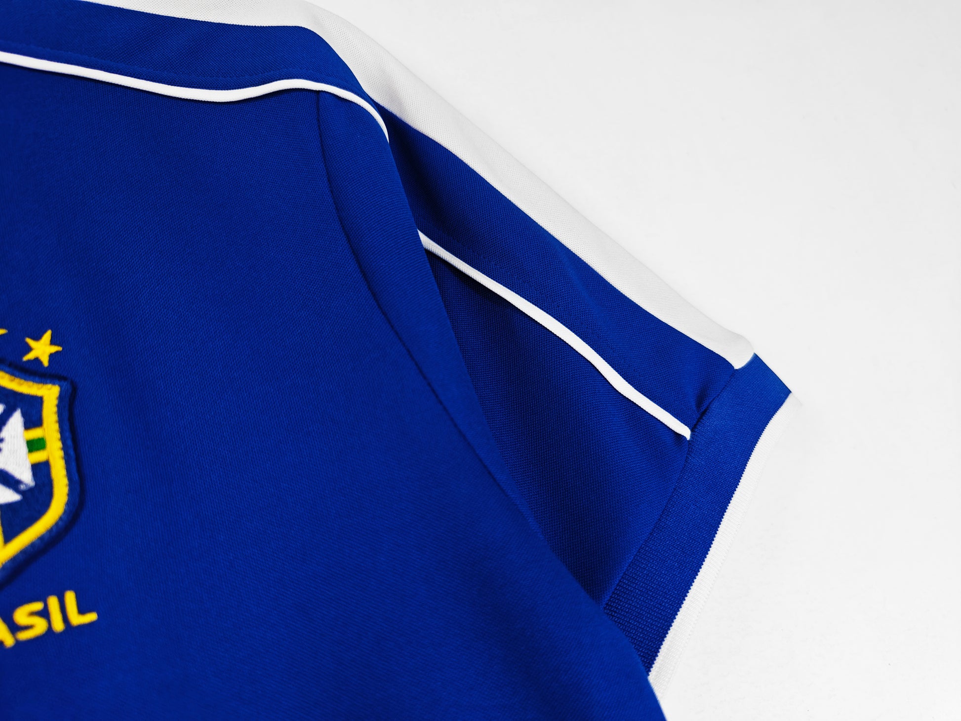 The 1998 away shirt, made by Nike, is one of Brazil’s most iconic blue jerseys. It featured a royal blue base with thin white stripes running down the shoulders and sleeves, accented by subtle green piping around the collar and cuffs. The collar itself was a simple round design with a touch of white and green trim, keeping it clean but distinctly Brazilian. The CBF crest with four stars sat on the left chest, opposite the Nike swoosh in white.