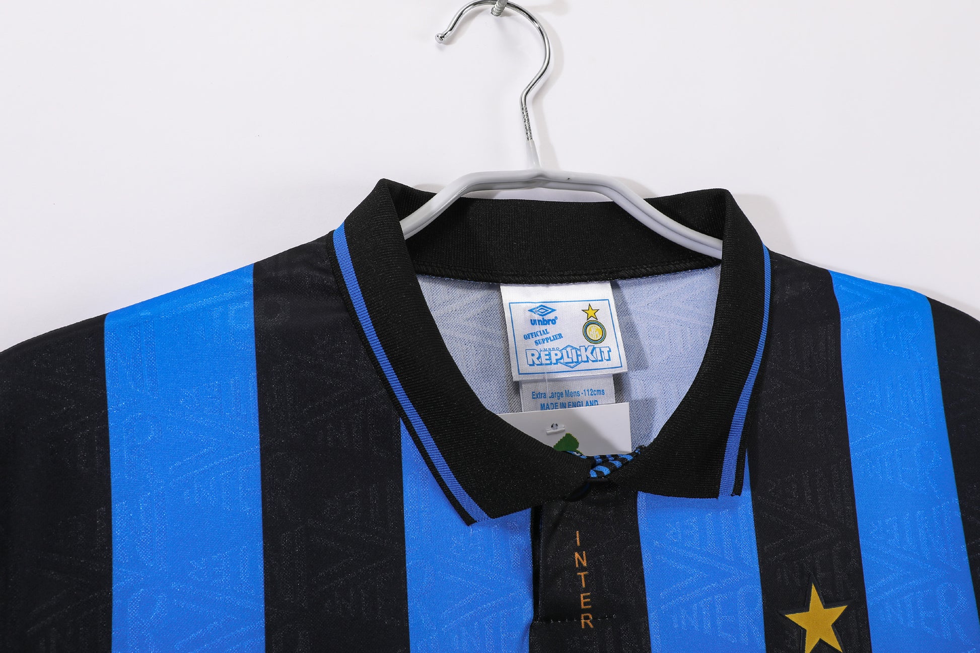 Celebrate a legendary era with the 1992/94 season Inter Milan home retro jersey. Crafted with attention to historical accuracy, this iconic design reflects the club’s classic blue and black stripes, embodying the spirit and style of early ’90s football. Perfect for collectors and enthusiasts, the jersey’s authentic look honors Inter Milan’s rich heritage on and off the pitch. Wear a piece of history that shows your expert appreciation for one of Italy’s most storied football clubs.