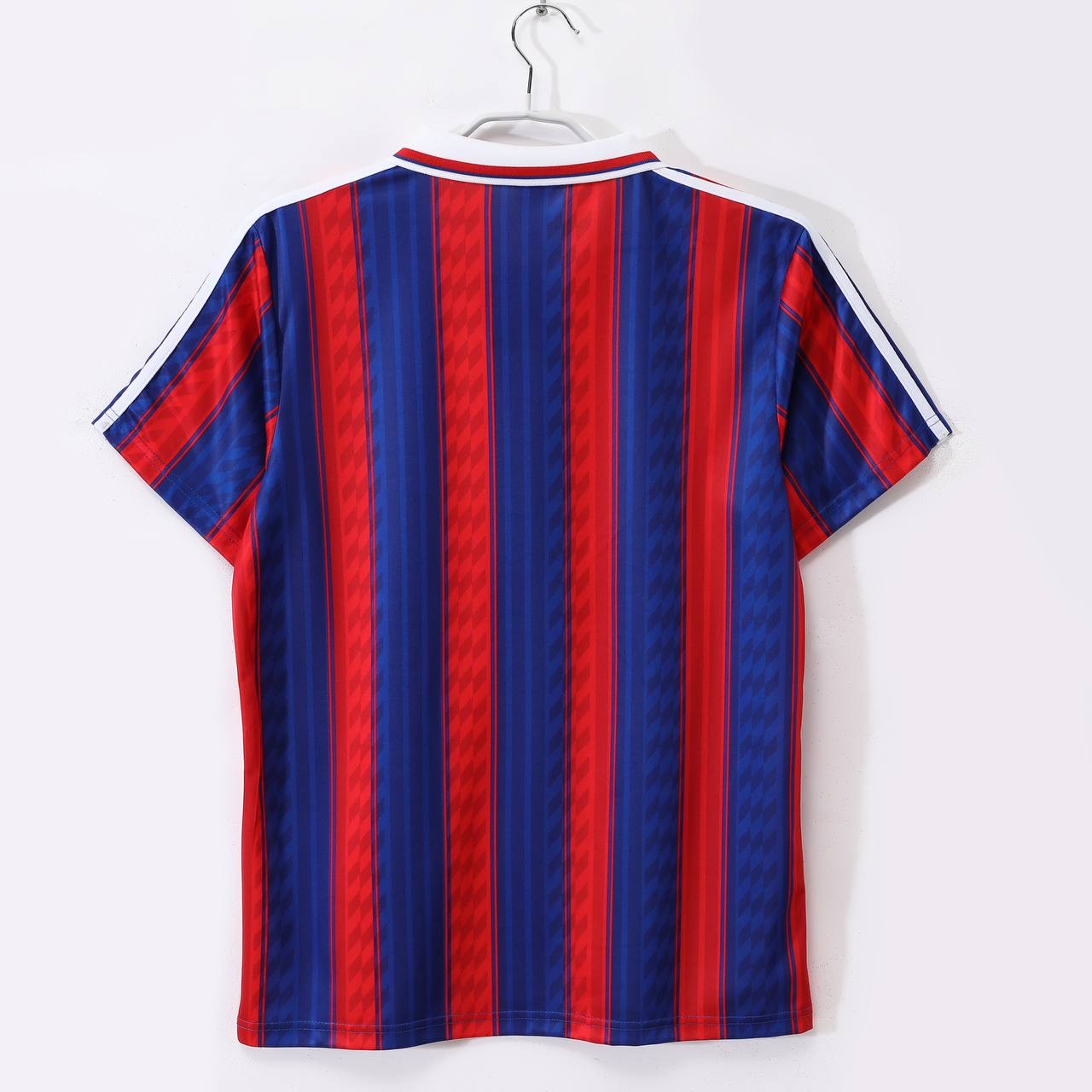 The 1995–97 Bayern Munich alternative shirt features bold vertical red and blue stripes with subtle white detailing on the collar and sleeves. Worn by stars like Lothar Matthäus, Mehmet Scholl, and Oliver Kahn, it was used during domestic and European campaigns in the mid-’90s. With striking colors and classic Adidas styling, it remains a standout kit for collectors and fans of Bayern Munich.