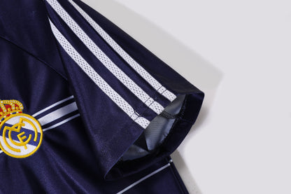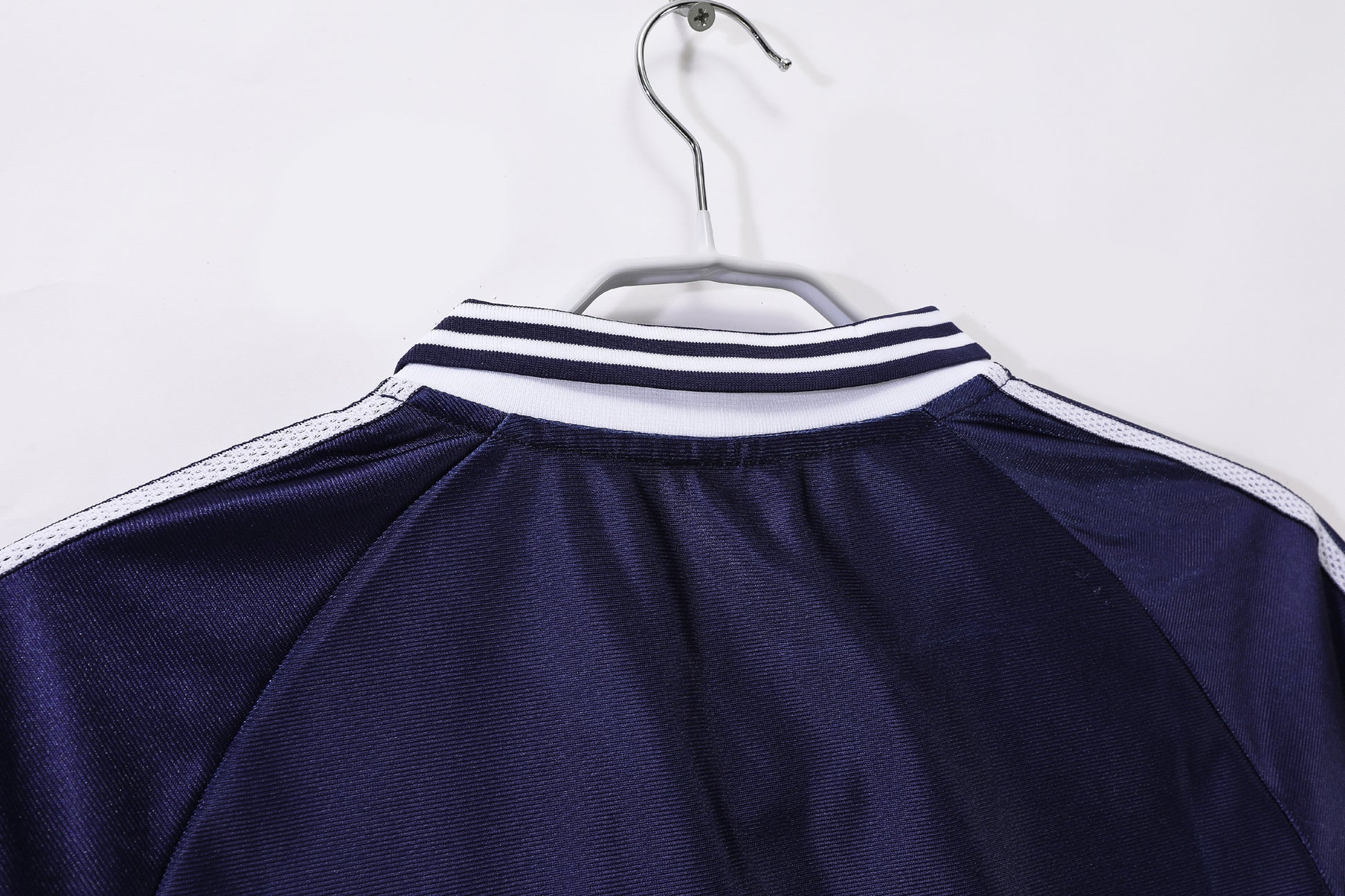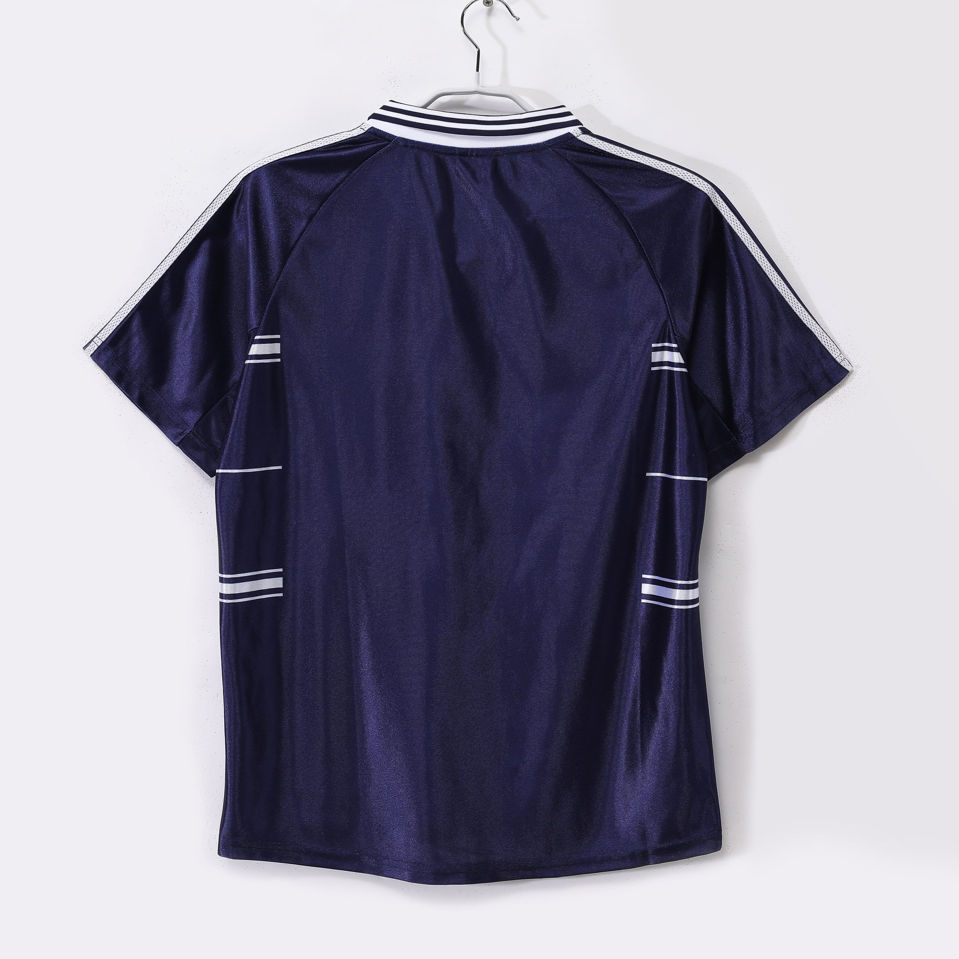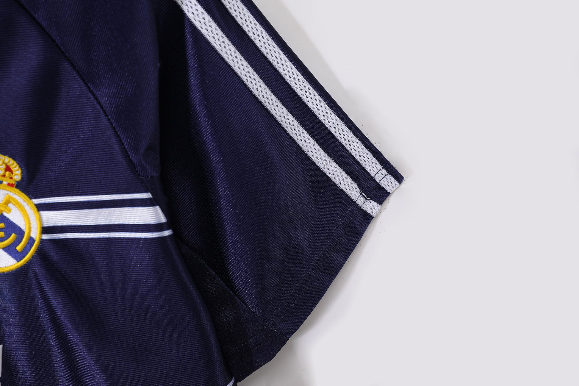 The away jersey was deep navy with white stripes and purple trim, used frequently in Europe by players like Roberto Carlos and Redondo, though its most memorable outings came in tough away matches where Madrid’s inconsistent performances cost them silverware.