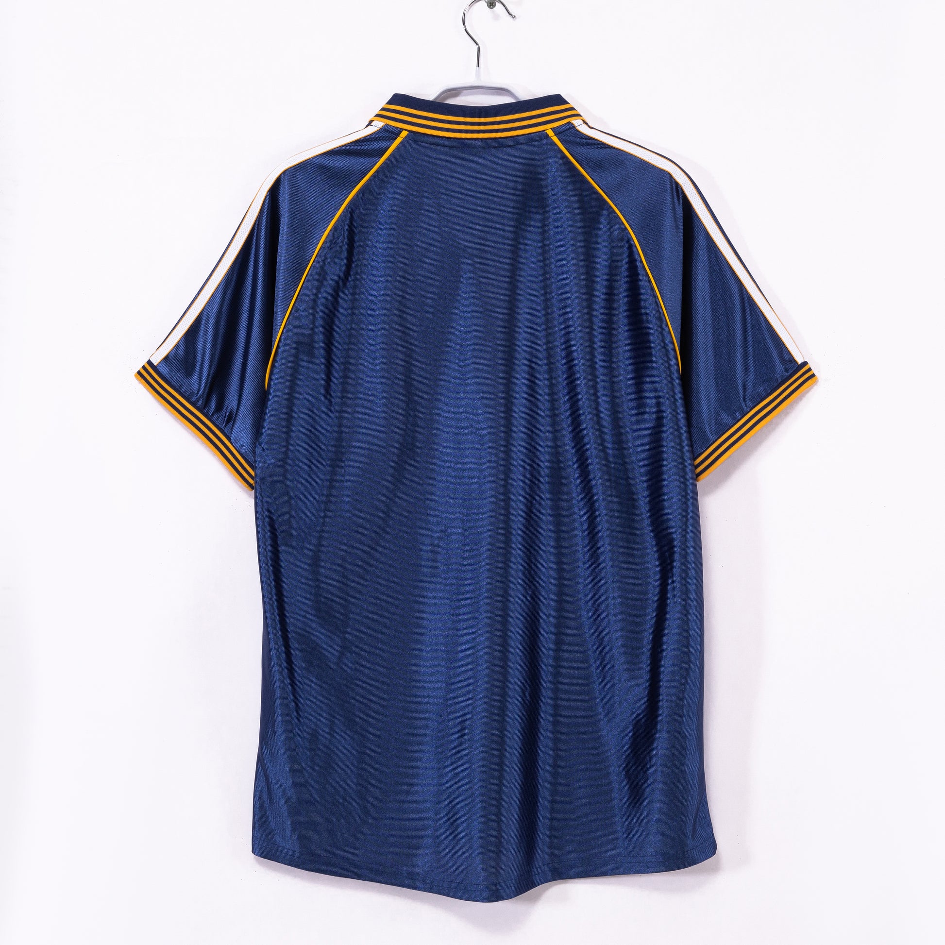 The away kit featured a bold purple (violet) base with white accents on the collar and sleeves, offering a striking contrast to the home whites. Also worn by stars like Raúl, Hierro, and Guti, it was used in domestic and European away fixtures, combining a daring color choice with classic Madrid styling.