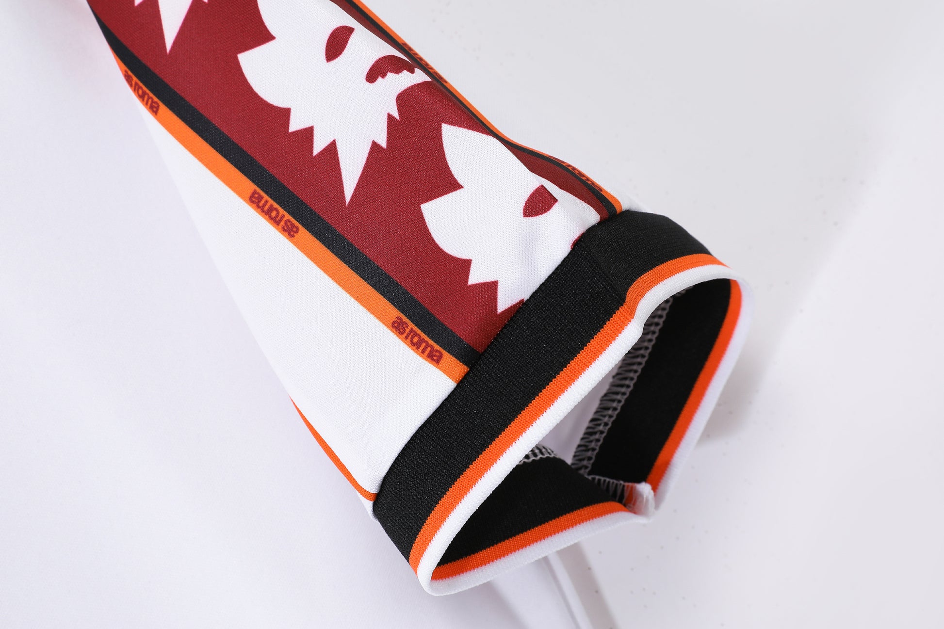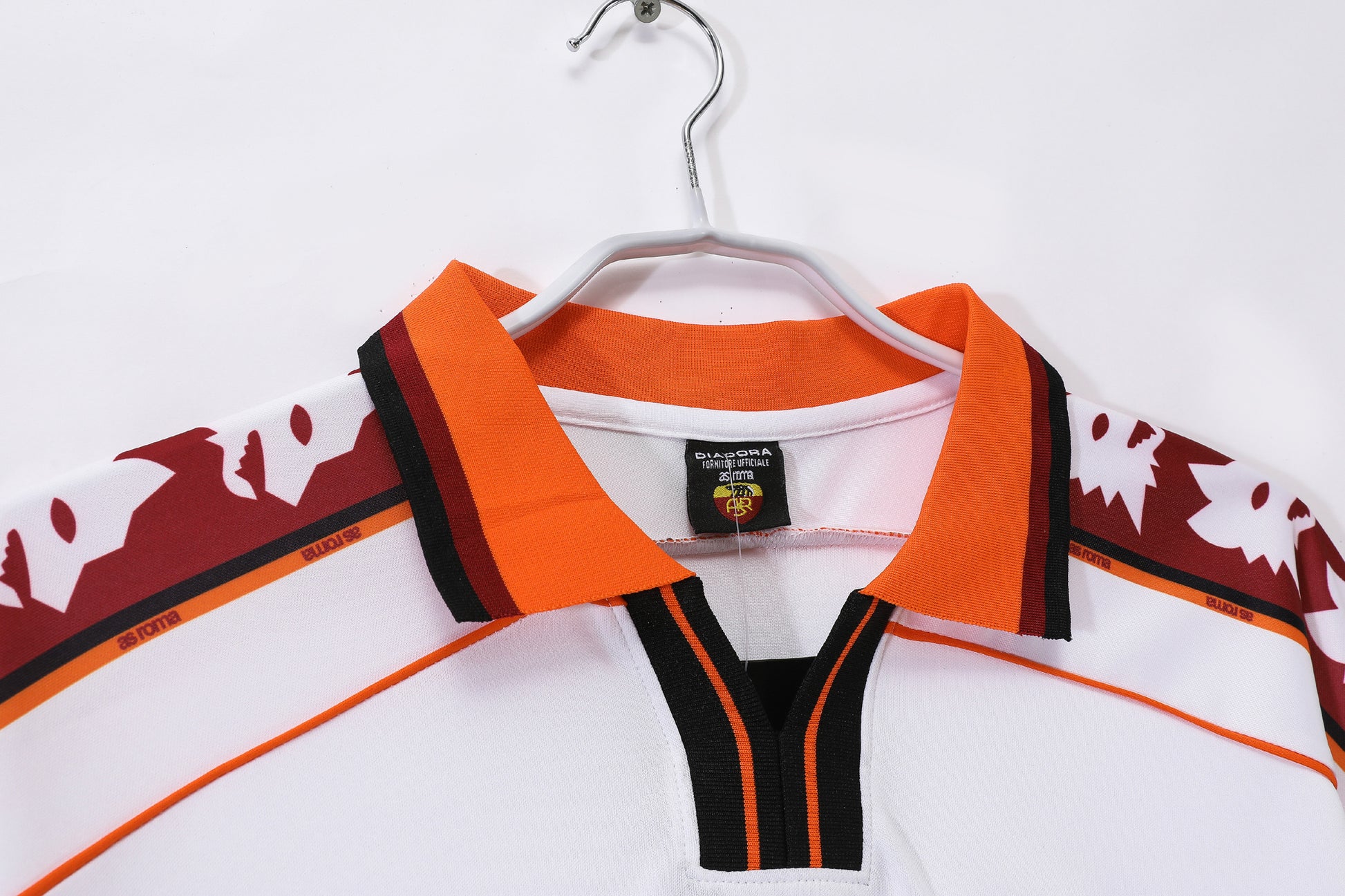 The 1998/99 away kit features a clean white base with red and yellow accents on the collar, sleeves, and sides, produced by Diadora for AS Roma’s Serie A campaign. Worn by stars such as Francesco Totti, Cafu, and Abel Balbo, this jersey accompanied the Giallorossi during a competitive season in both domestic and European competitions. Its classic design and connection to a golden era of Roma football make it a favorite among fans and collectors of iconic Italian club kits.