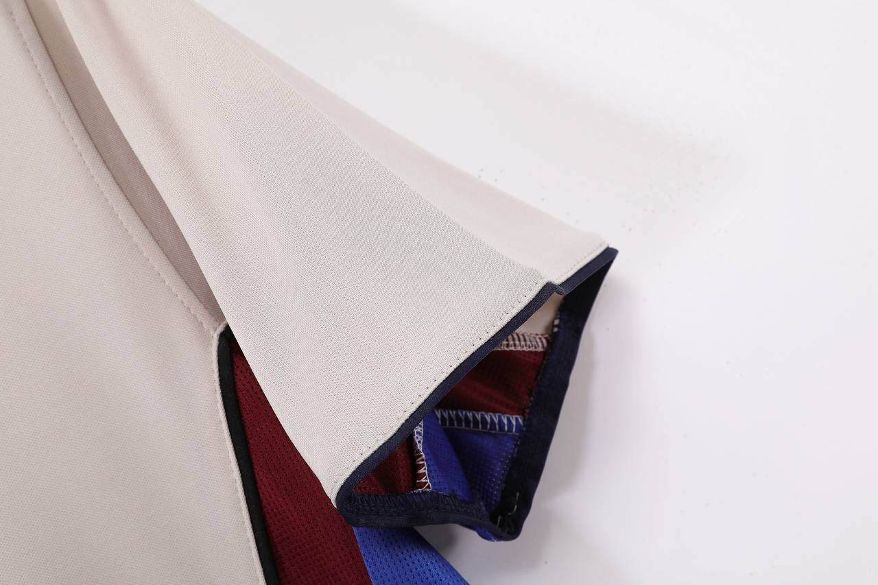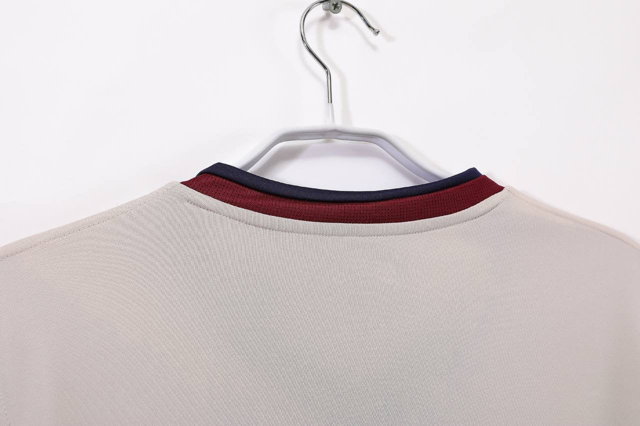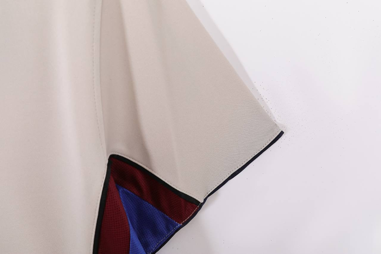 The 1998/99 Barcelona away shirt by Nike stood out with its rare beige base, a big departure from the club’s traditional bold colors. It featured dark navy shoulders and sleeves, with a central vertical Blaugrana stripe (blue and red)running down the chest, giving it a classy yet distinctive identity. The Nike swoosh appeared in navy, while the Kappa-style FCB crest of the late ’90s sat proudly in full color. Paired with navy shorts and beige socks, this away kit became iconic as part of Barcelona’s centenary season, worn by legends like Rivaldo, Figo, and Luis Enrique during Louis van Gaal’s spell.