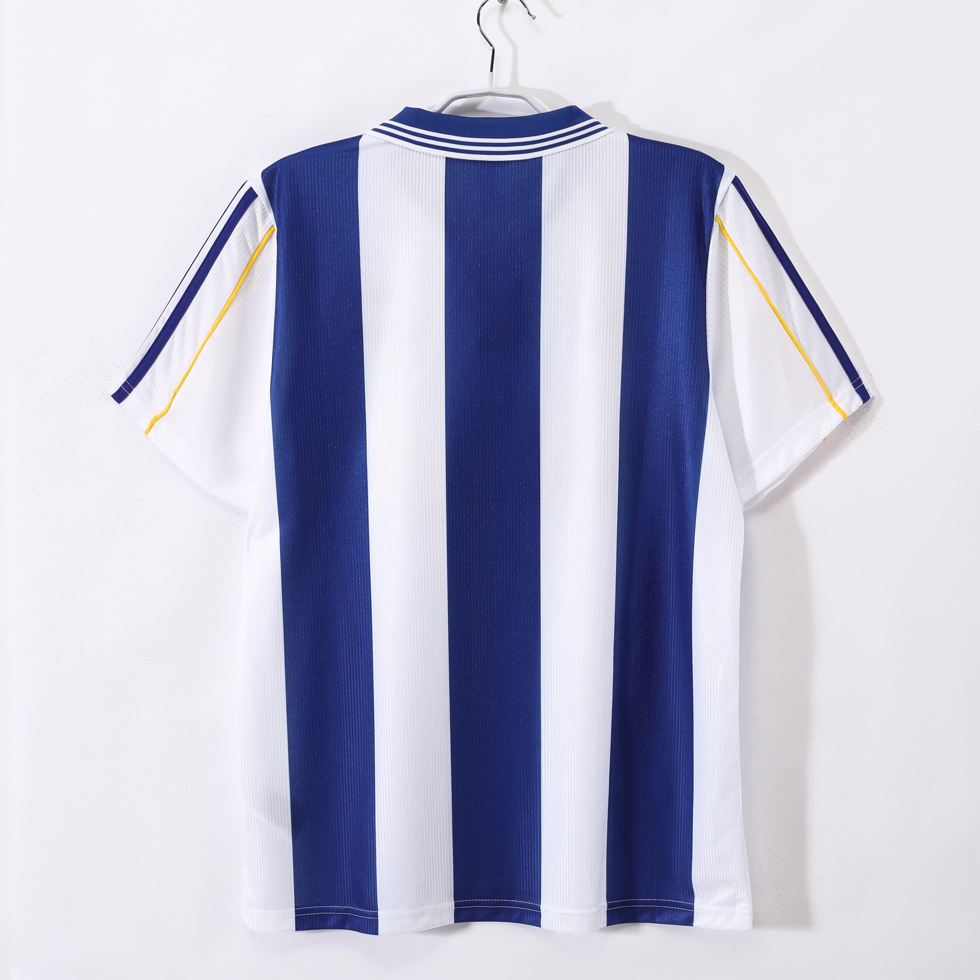 The home shirt kept Deportivo’s timeless identity with broad blue and white vertical stripes, blue sleeves, and matching blue shorts, all produced by Joma and carrying the Feiraco sponsor across the chest. It became legendary that season, worn by heroes like Roy Makaay, Djalminha, Fran, Mauro Silva, and Noureddine Naybet as Deportivo stunned Spain by winning their first-ever La Liga title, sealing their place in history.