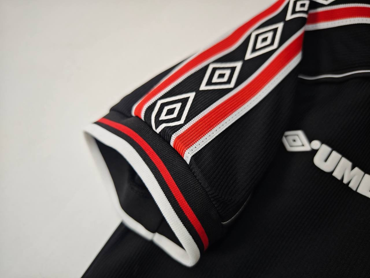 The 1998/99 Manchester United black third kit was a less common alternative, designed by Umbro and featuring the Sharp sponsor prominently across the chest. The shirt was predominantly black with subtle tonal patterns, red and white accents on the collar and sleeves, paired with black shorts and socks. It was worn by key players such as Ryan Giggs, David Beckham, Roy Keane, and Dwight Yorke in European away matches and domestic games where both red and white kits would clash. This sleek black kit provided a bold, modern option during United’s treble-winning season, combining style with functionality for challenging away fixtures.