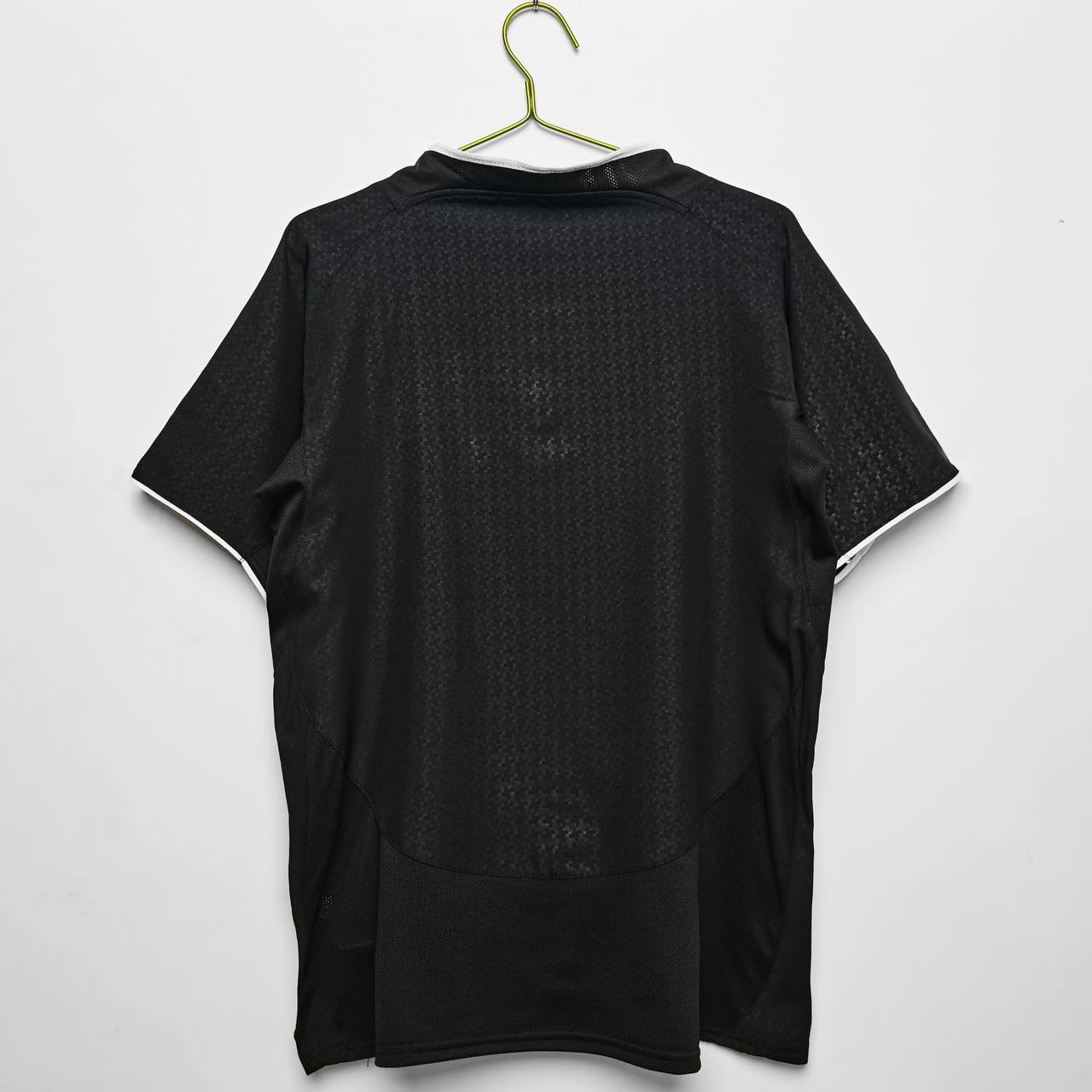 The 2003/04 Manchester United black kit was the third kit, designed by Nike and sponsored by Vodafone. Predominantly black with subtle tonal panels and thin red trim on the collar and sleeves, it was paired with black shorts and socks. Key players such as Ryan Giggs, Ruud van Nistelrooy, Paul Scholes, and Roy Keane wore this kit in select domestic cup matches and European away fixtures where the red home and white away shirts clashed. Its sleek, modern design provided a bold alternative to the traditional kits, combining style and functionality during United’s Premier League and Champions League campaigns.