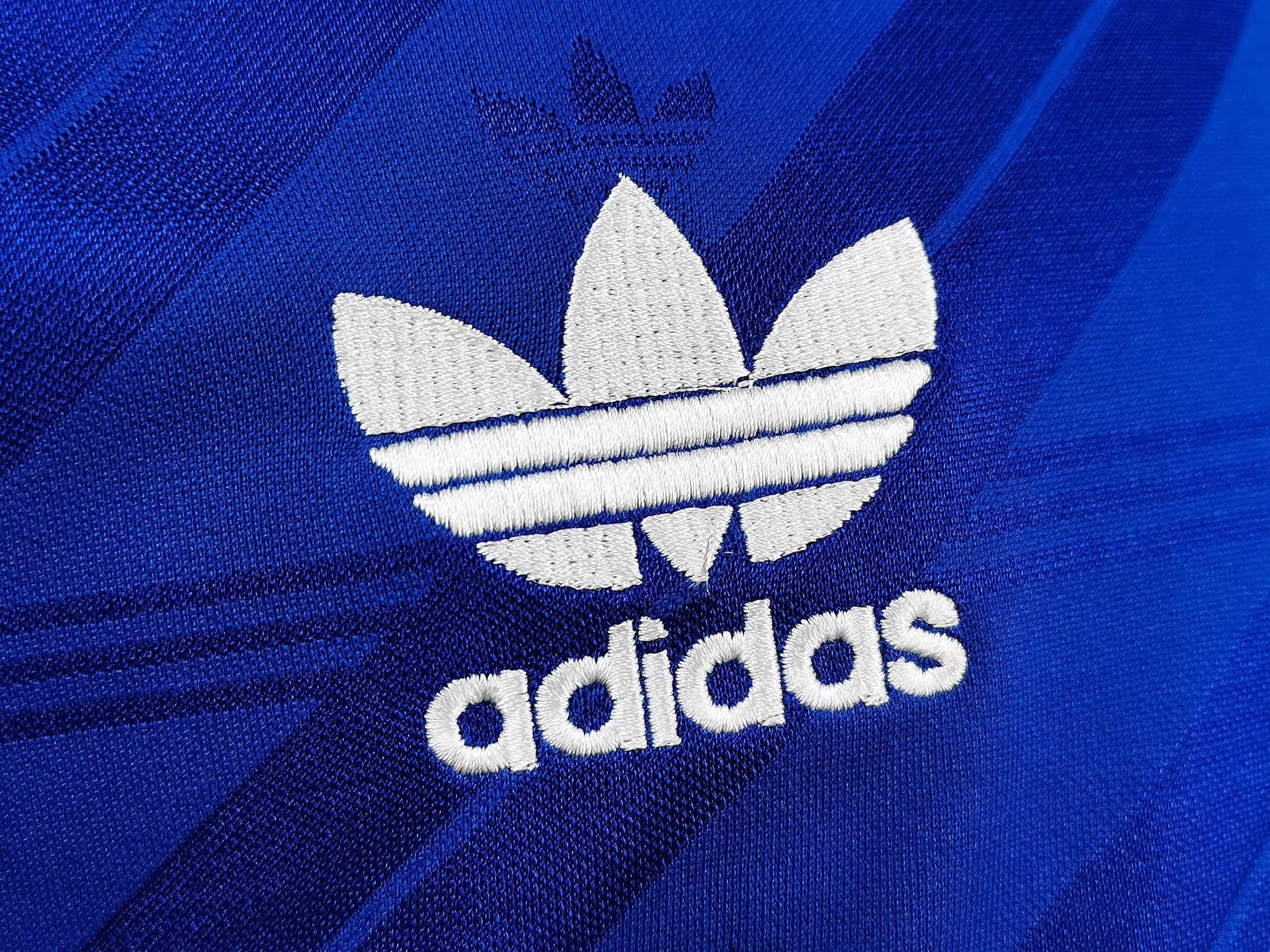 The 1986–88 Manchester United away kit is a standout in the club’s history, known for its bold blue and white design. This kit was worn during a period of transition for the club, marking the early years of Sir Alex Ferguson’s tenure as manager. The shirt features a tonal Adidas pattern, a smart red and white striped V-neck collar, and matching sleeve cuffs, complemented by the iconic “Sharp” sponsor logo across the chest. Notably, this was the first-ever official blue away kit for Manchester United, worn by legends like Bryan Robson and Norman Whiteside.