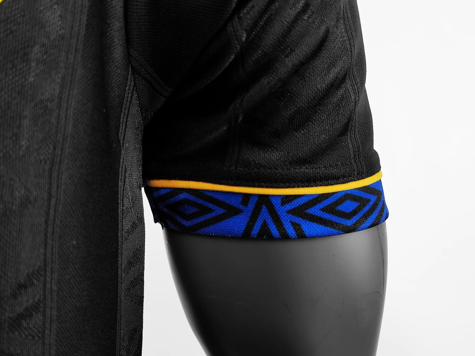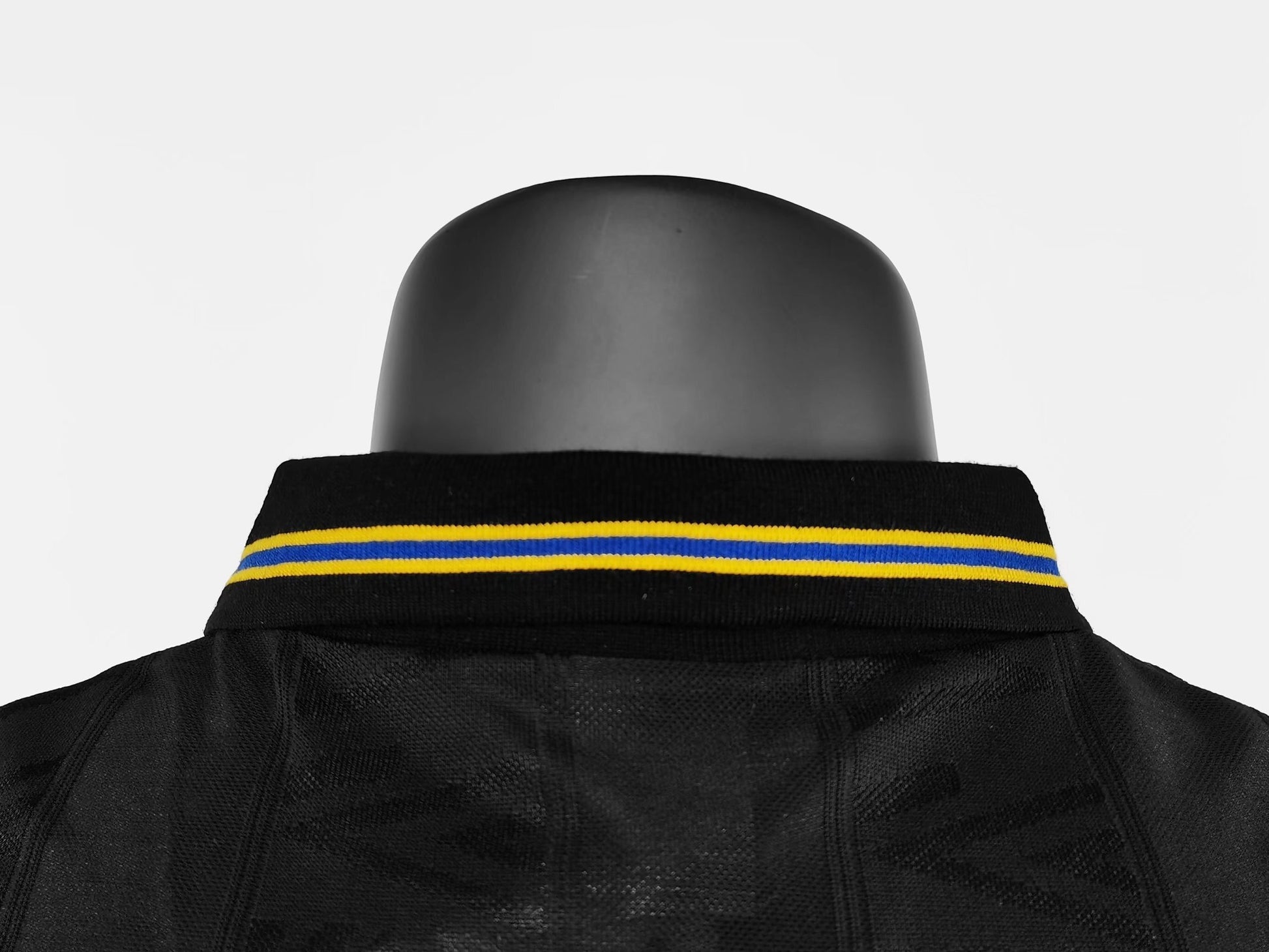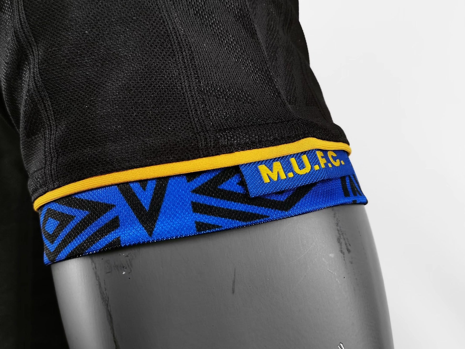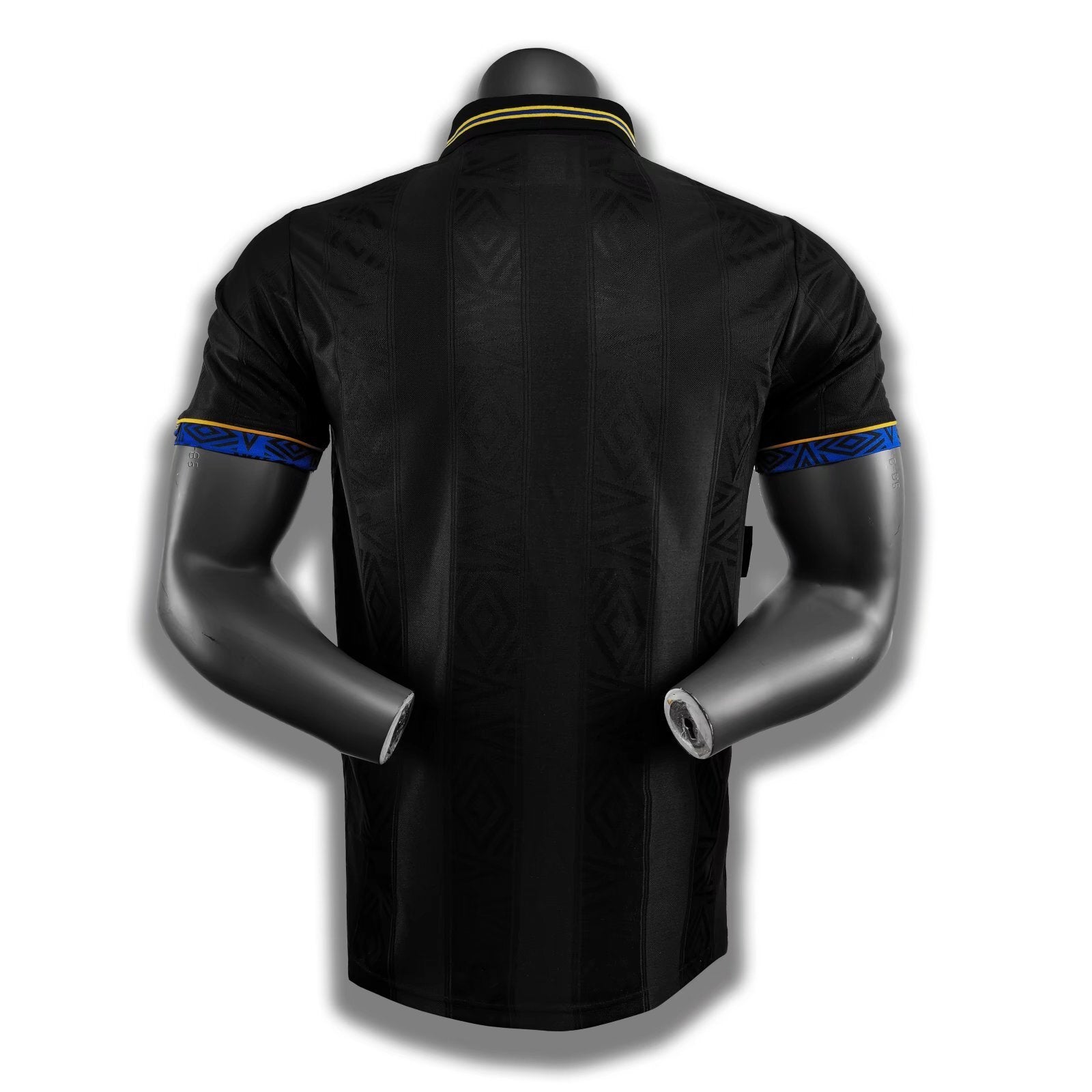 The 1993–94 Manchester United away kit, designed by Umbro, is a standout in the club’s history, known for its bold black design with yellow and blue accents. This kit was worn during a season where United clinched the Premier League title, marking a significant achievement in their dominance of English football. The shirt features a tonal Umbro pattern, a smart black collar with a blue and yellow stripe, blue Umbro patterned sleeve hems with yellow edging, and a yellow “Sharp Viewcam” sponsor across the chest. Notably, this was the first-ever official black kit for Manchester United, worn by legends like Eric Cantona