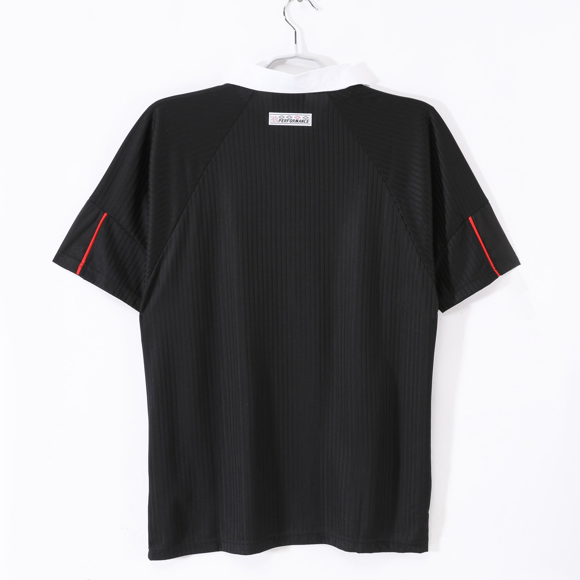 The England 1998 black away goalkeeper shirt, made by Umbro, is one of the most memorable goalkeeper kits of the late 1990s. It was famously worn by David Seaman during the 1998 FIFA World Cup in France, most notably in the match against Argentina. The shirt featured a bold black base with striking yellow and grey geometric panels across the chest, shoulders, and sleeves, giving it a distinctive and intimidating look. The Umbro logo sat on the right chest, the Three Lions crest on the left, and the shirt carried a traditional oversized goalkeeper cut with padded elbows. This kit became iconic not just for its design, but also for Seaman’s performances, cementing its place in England kit history.