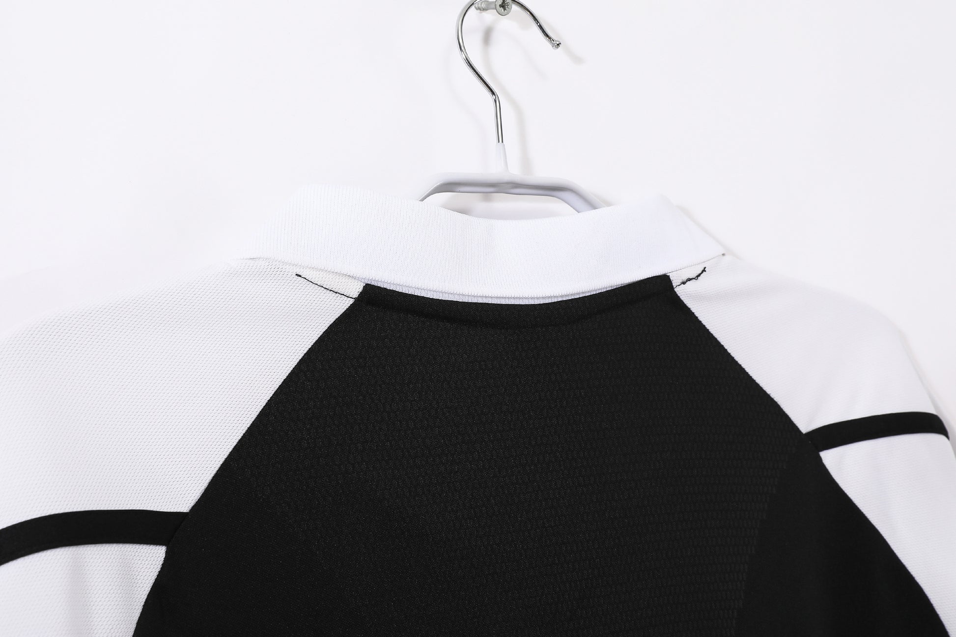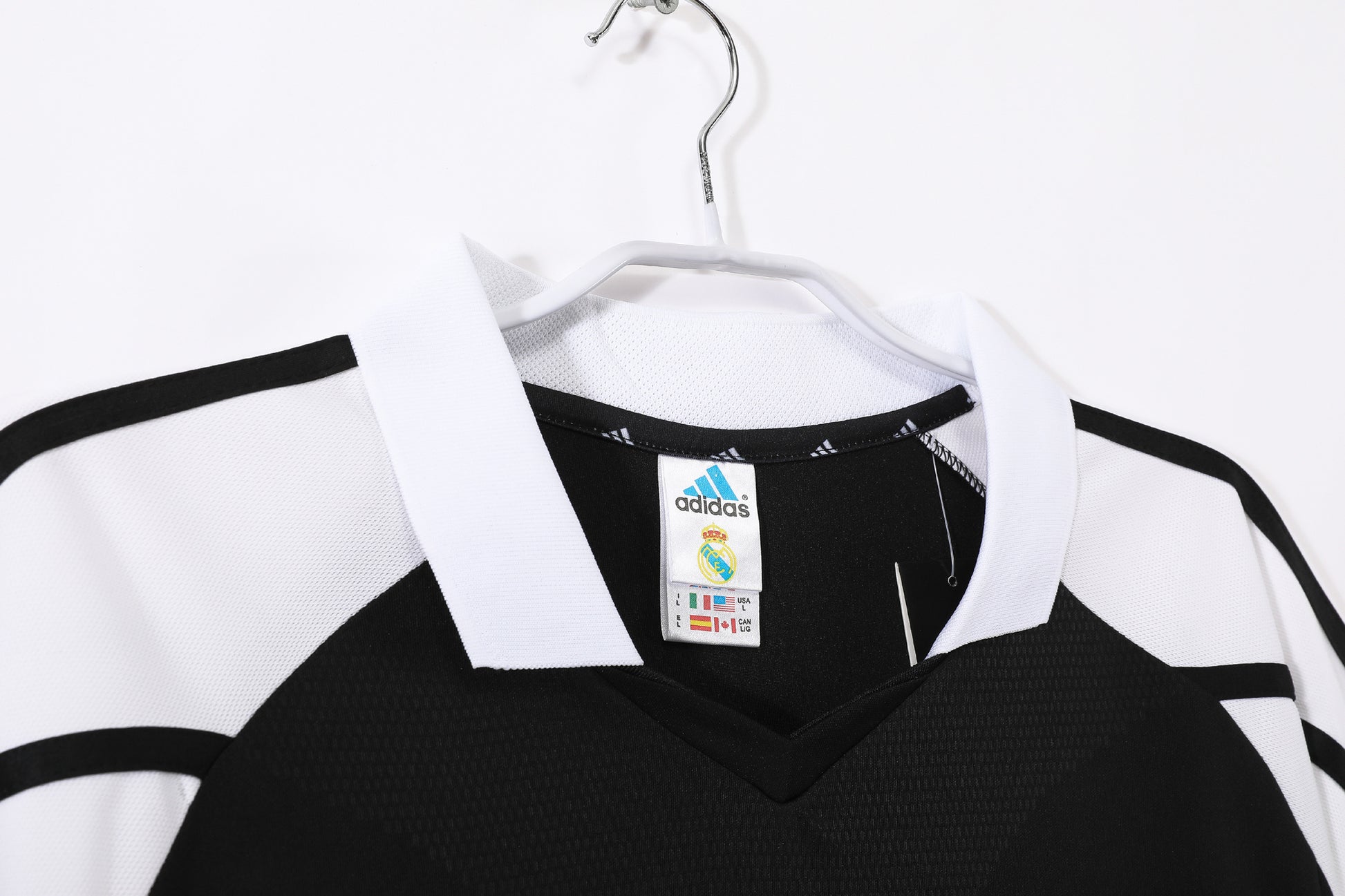 This is the Real Madrid 2002/03 away jersey, made by Adidas and sponsored by Realmadrid.com, one of the most distinctive sponsorships in the club’s history as it promoted their official website. The shirt features a sleek black base with white shoulders and Adidas’ trademark three stripes running down the sleeves, complemented by a sharp v-neck collar. The Real Madrid crest is placed proudly on the chest alongside the Adidas logo, while the sponsor sits prominently across the front. This kit was worn by legends like Zinedine Zidane, Ronaldo Nazário, Raúl, Roberto Carlos, and Luís Figo during a season when Real Madrid won La Liga and the Intercontinental Cup, while also reaching the Champions League semifinals under Vicente del Bosque.
