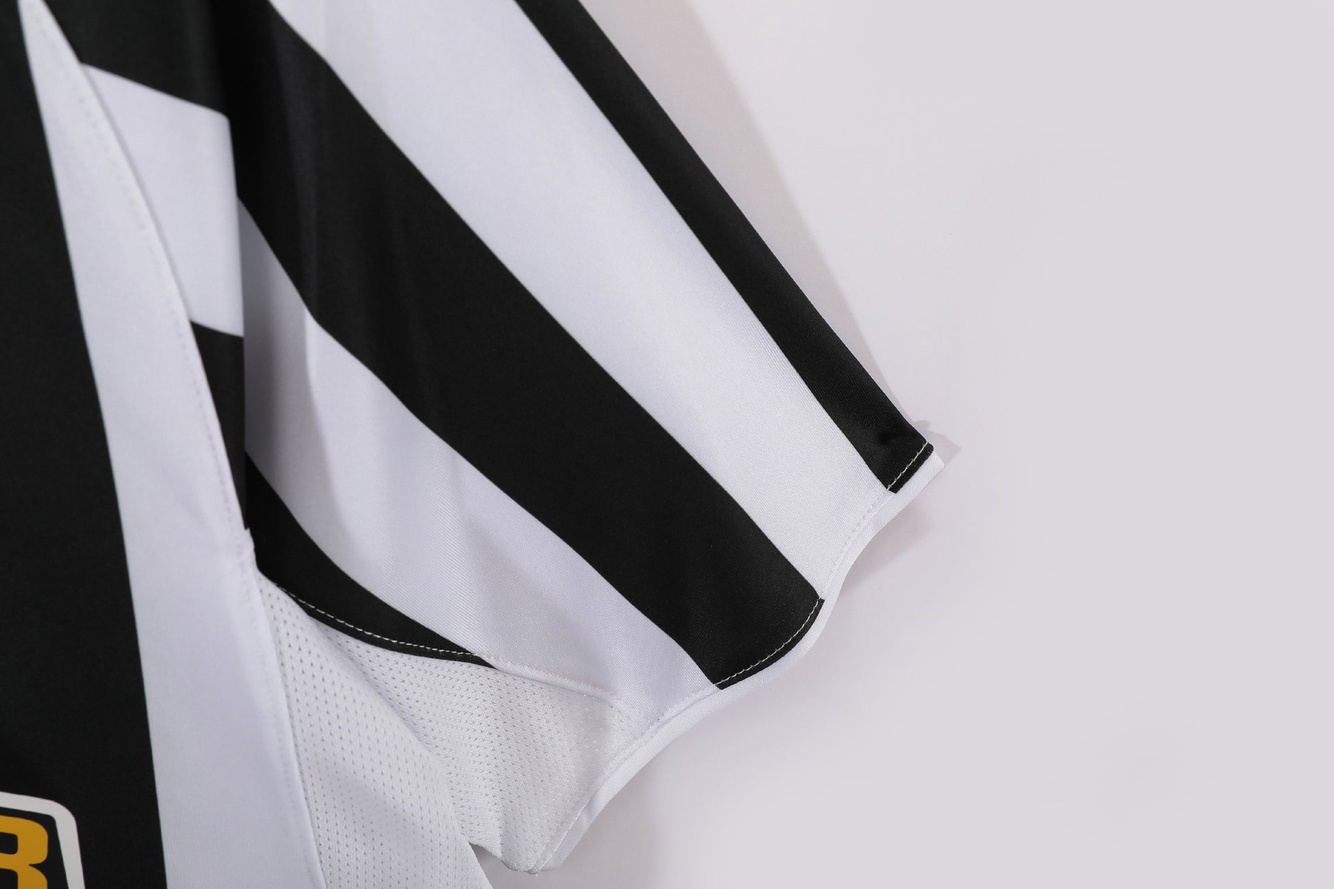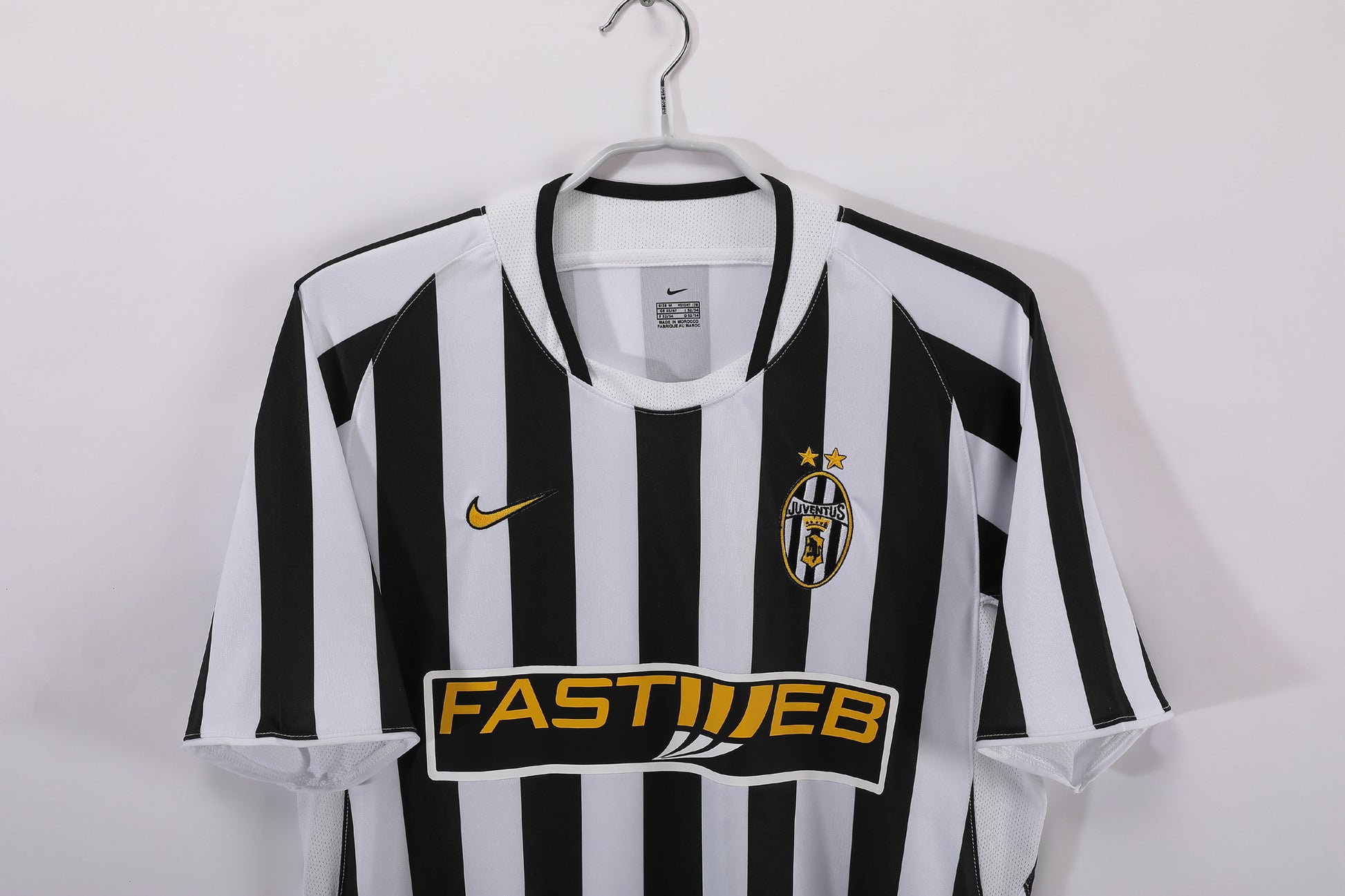 Juventus’ home shirt had the classic black-and-white vertical stripes, though slightly thinner than usual, with a black V-neck collar. Nike supplied the kit, with the swoosh in yellow and the Tamoil sponsor in its familiar blue oval across the chest. Black shorts with white trim and black socks with white details completed the set. Worn by stars like Del Piero, Nedvěd, and Trezeguet, Juve finished 3rd in Serie A that year.