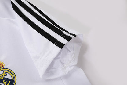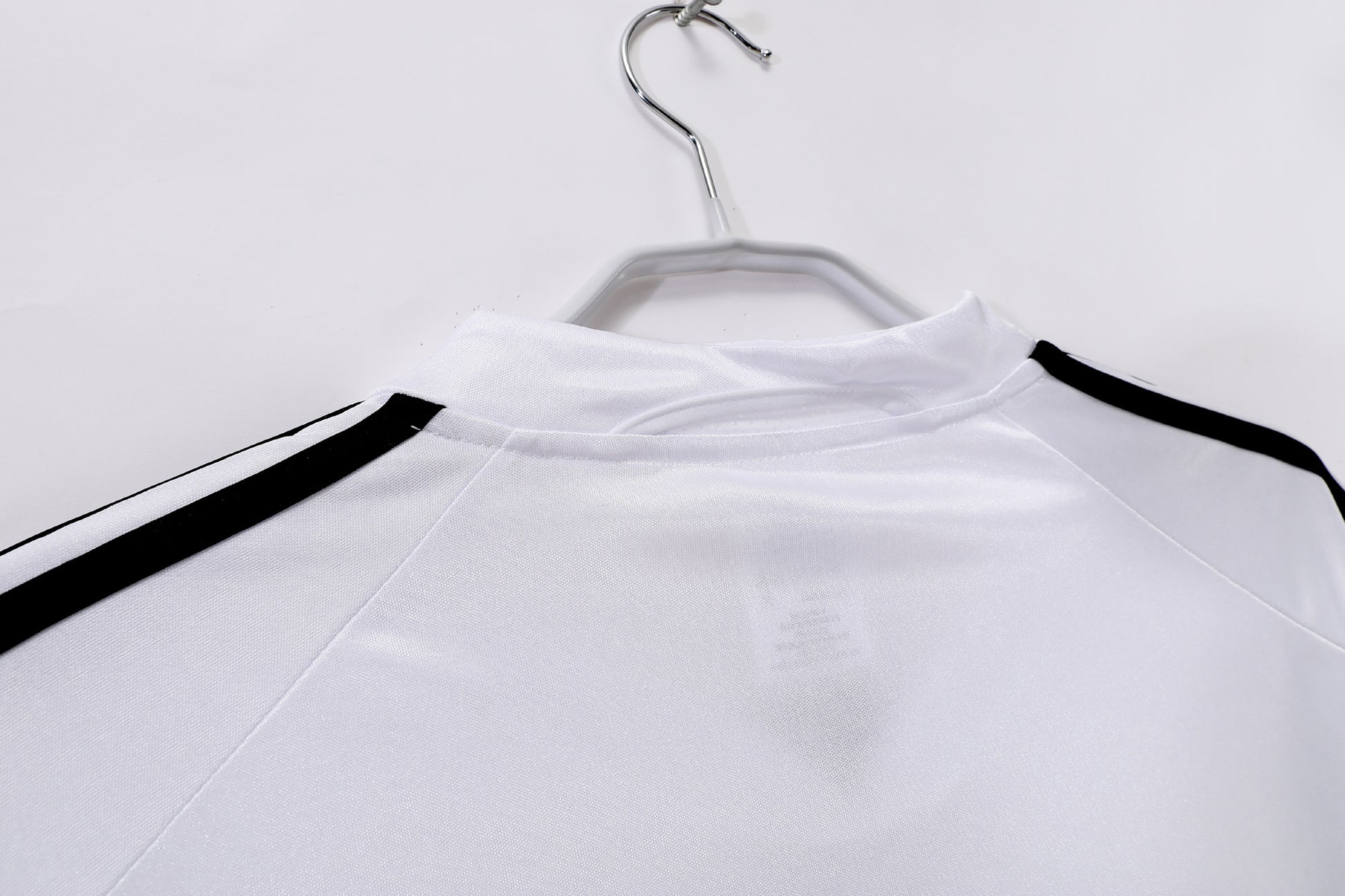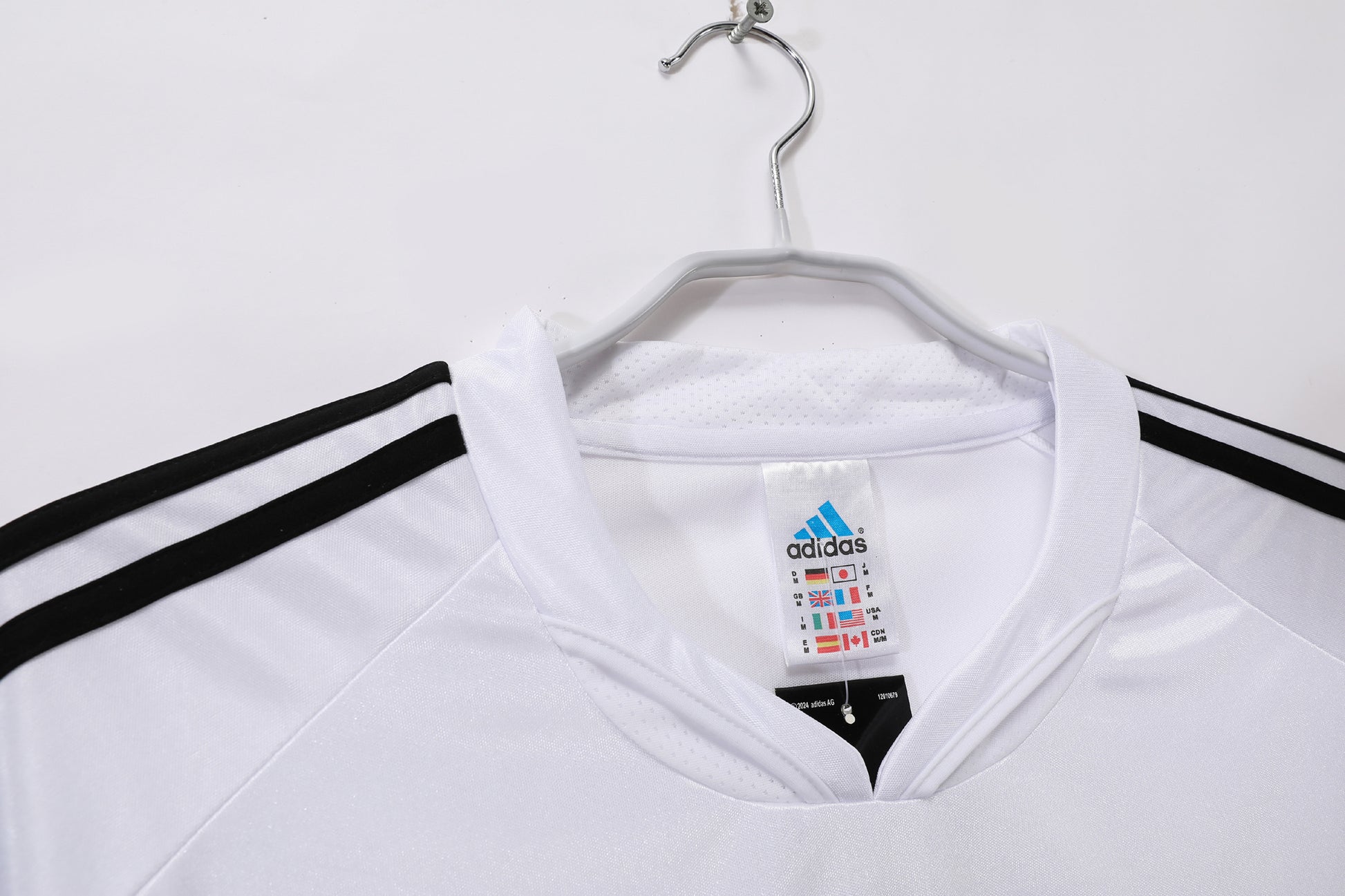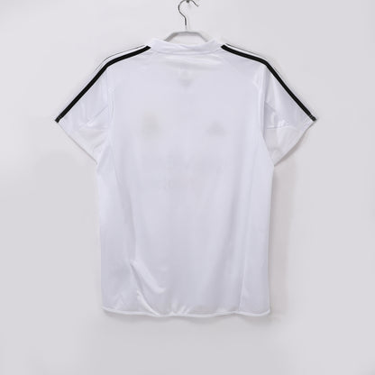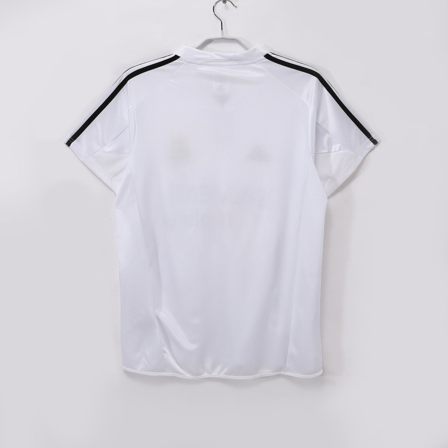 The 2004/05 home jersey, Adidas with Siemens Mobile, maintained the iconic all-white with subtle black shoulder stripes, worn by Beckham, Raúl, and Zidane, and although elegant, it is remembered more for managerial upheaval and underachievement as Madrid went without trophies again.