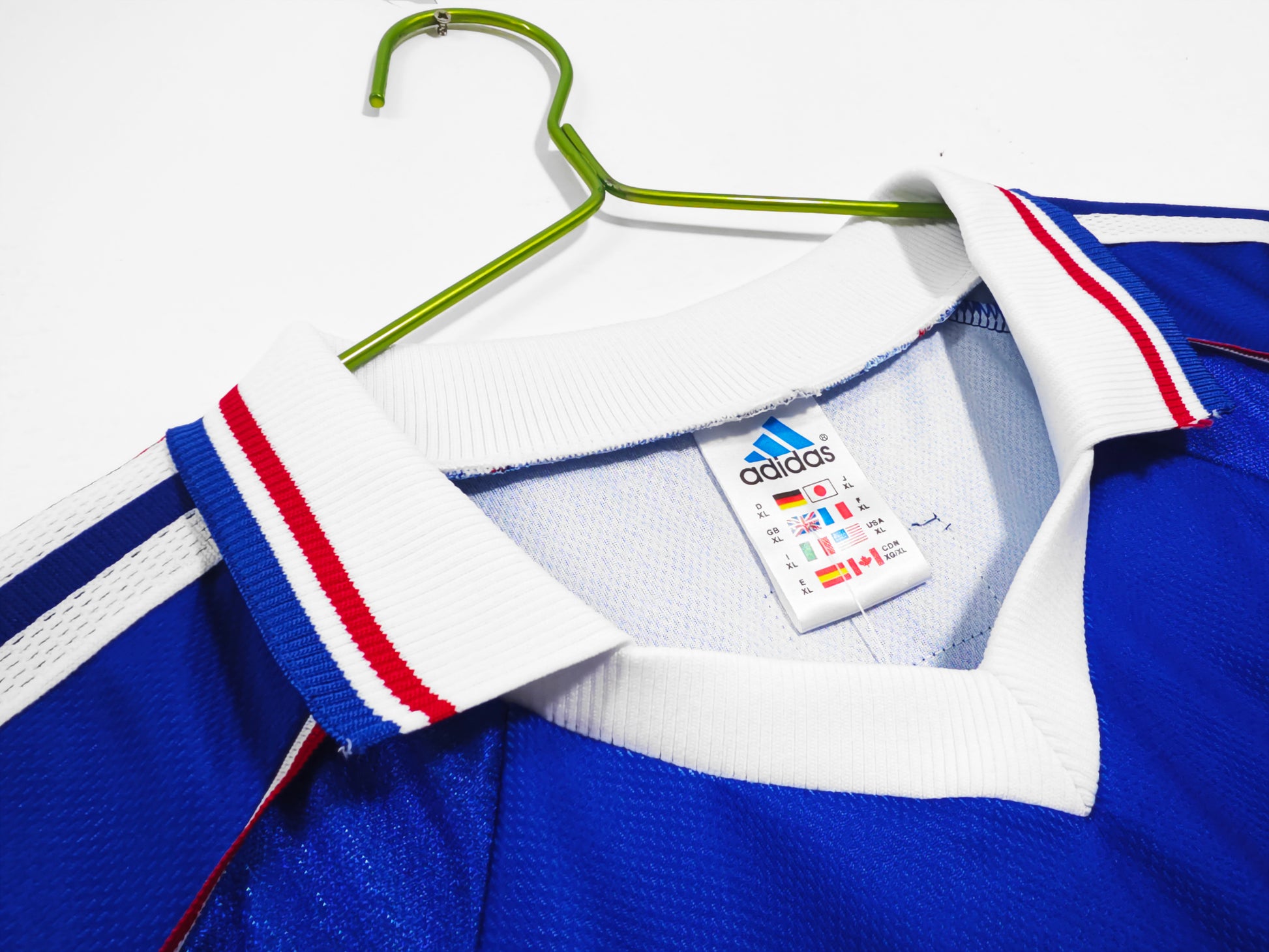 The 1998 World Cup home jersey, made by Adidas, is one of France’s most iconic shirts. It features a solid blue body with subtle red and white vertical piping along the sides, giving it a sleek, modern feel. The FFF crest sits on the left chest, with Adidas on the right. Worn during the 1998 World Cup, this kit became legendary as France won the tournament on home soil, with stars like Zinedine Zidane, Didier Deschamps, and Emmanuel Petit making history. The kit was completed with white shorts and red socks, reflecting the tricolor theme.