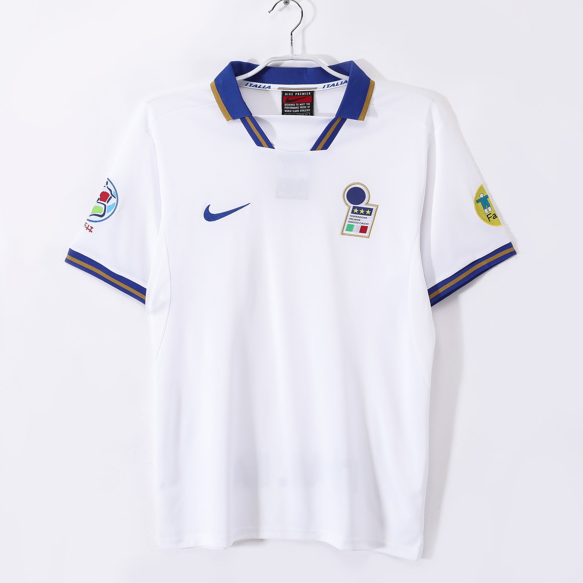 The 1996 away kit features a clean white base with blue trim on the collar and cuffs, produced by Nike for Italy’s campaign at UEFA Euro 1996 in England. Worn by stars such as Paolo Maldini, Alessandro Del Piero, and Gianfranco Zola, this jersey represented the Azzurri during a competitive group stage against some of Europe’s strongest sides. Its minimalist design and direct connection to Euro 96 make it a favorite among fans and collectors of 90s Italy kits.
