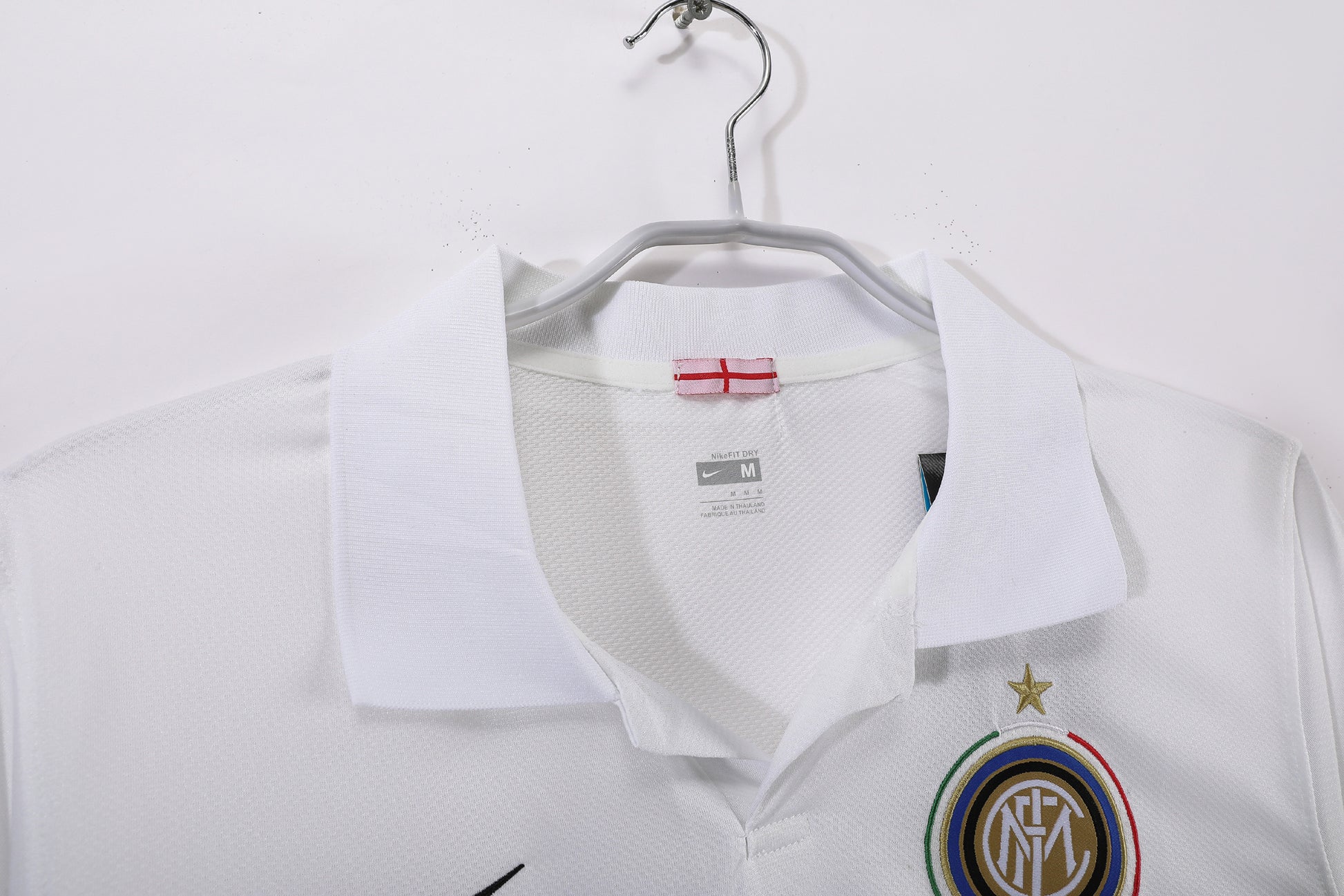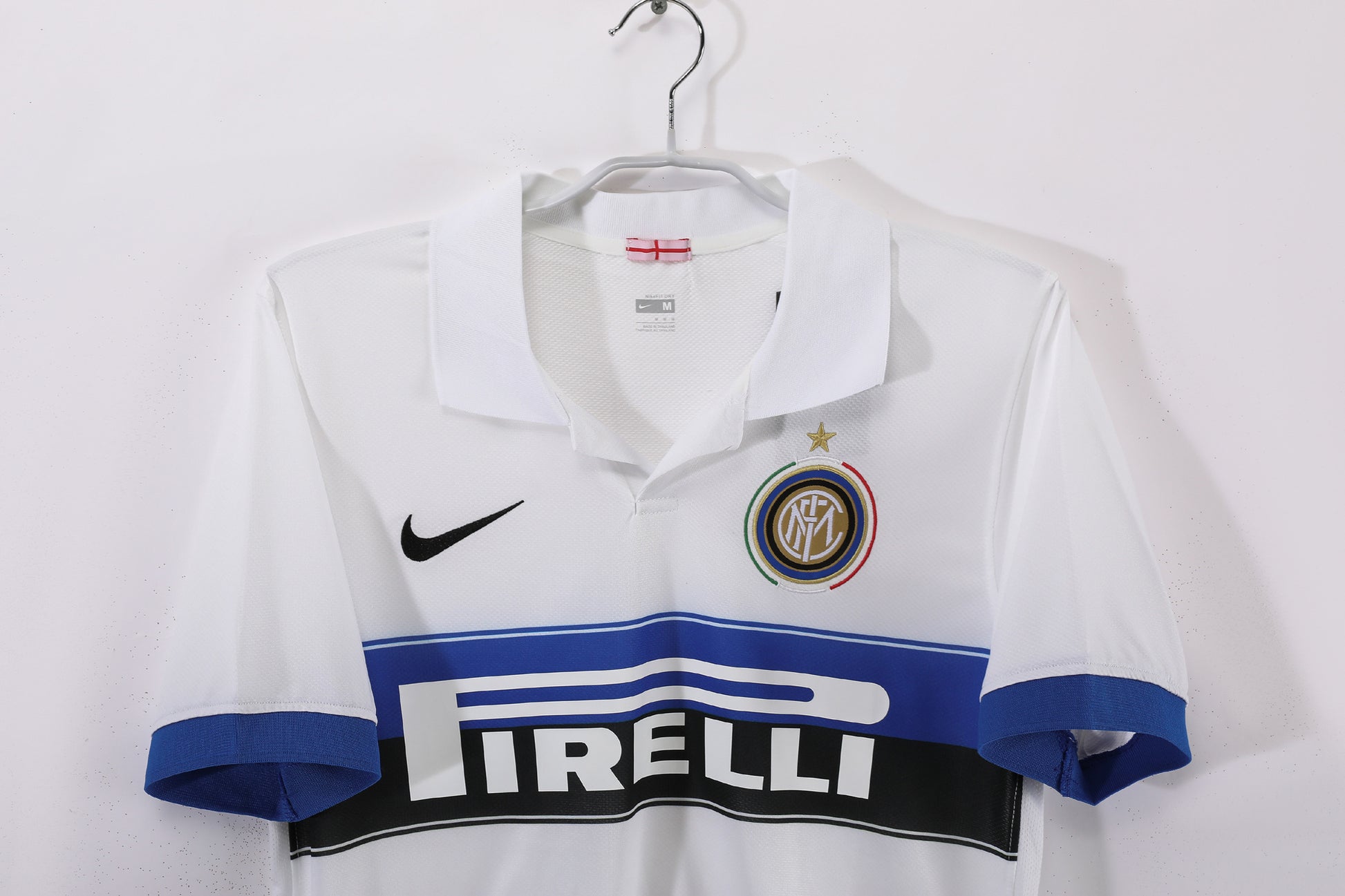 The away jersey was predominantly white with thin black and blue trim along the shoulders and sides, giving a clean and classic appearance. Nike and Pirelli logos appeared in black on the chest. White shorts and socks with subtle blue and black detailing completed the kit, offering a strong contrast to the home colors for away matches.
