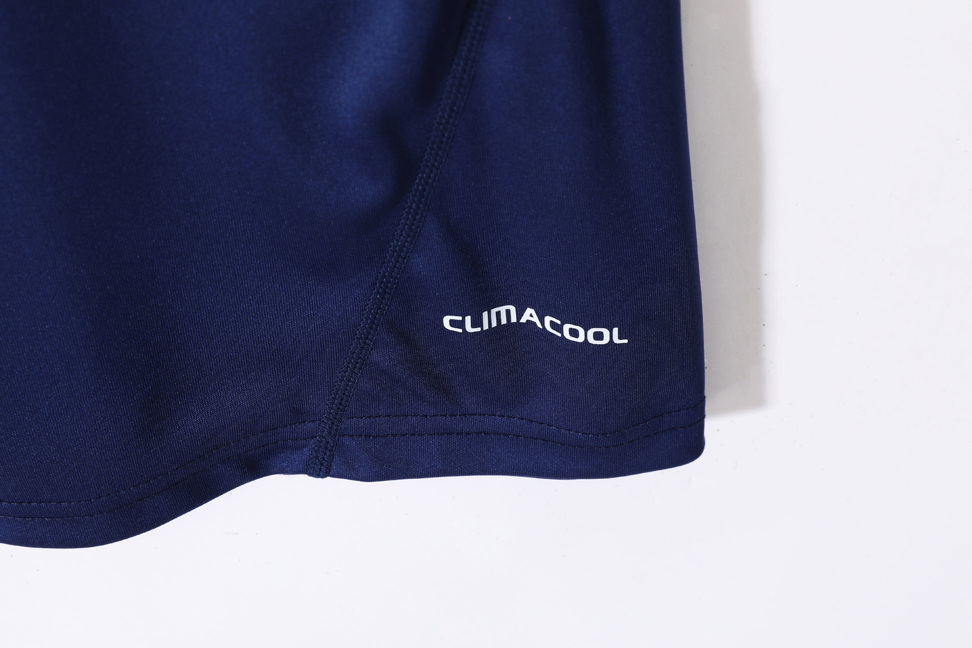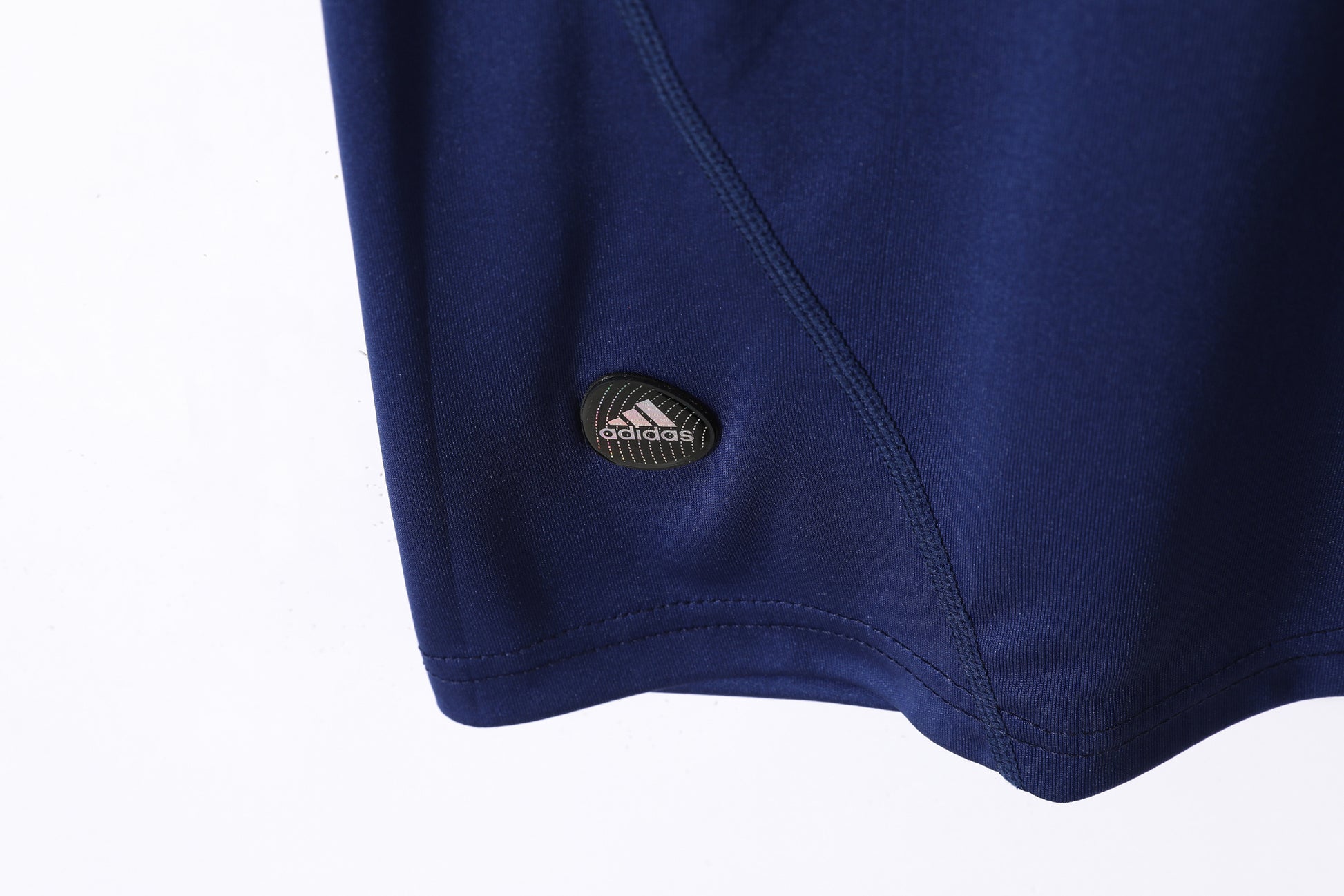 The away kit of 2010 was a bold departure, built around a navy blue base with a distinctive golden-yellow diagonal sash across the front, accented by red Adidas stripes on the shoulders and light blue shorts, giving it a modern, eye-catching look that contrasted strongly with the home kit during Spain’s historic championship run.