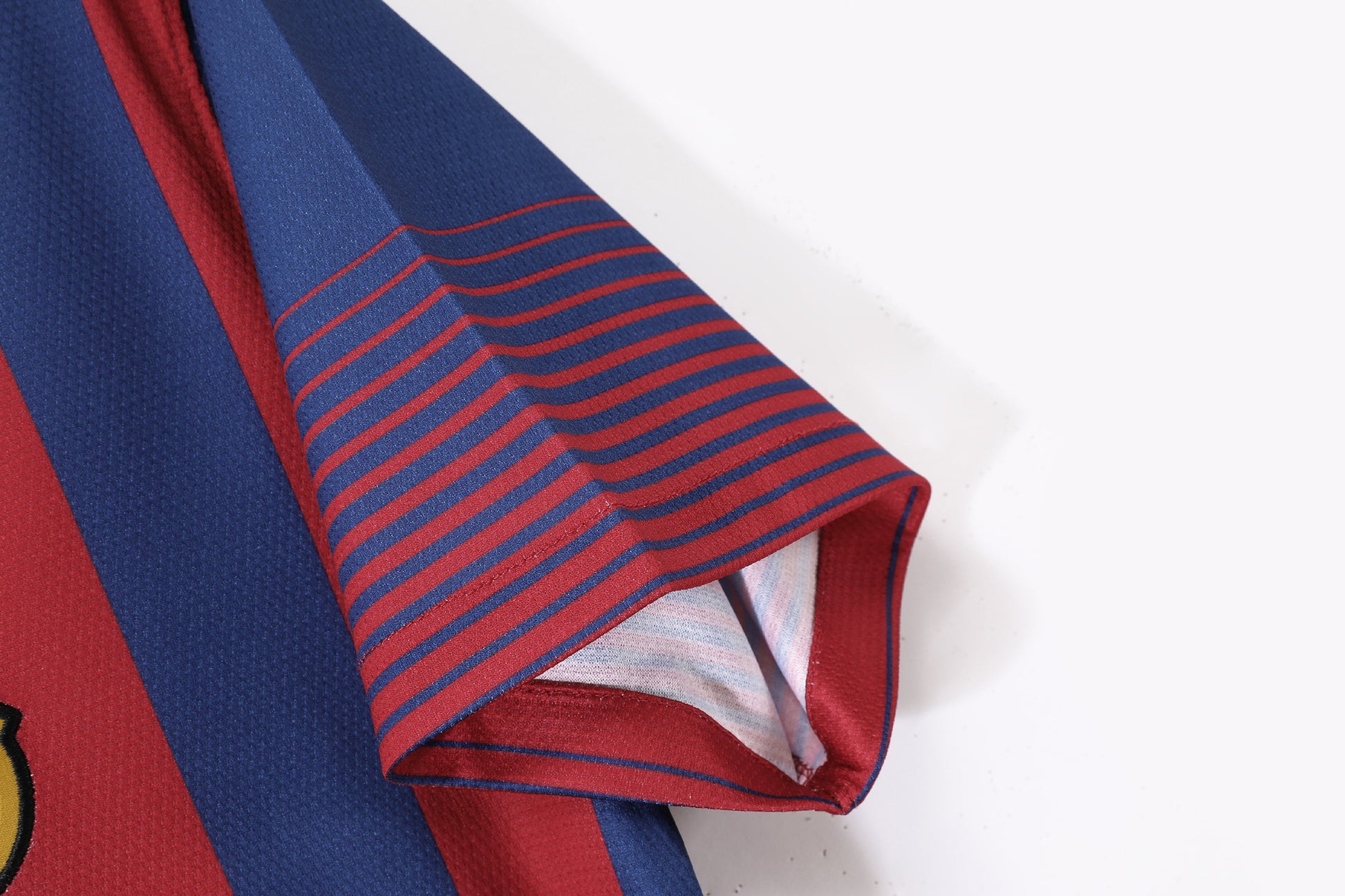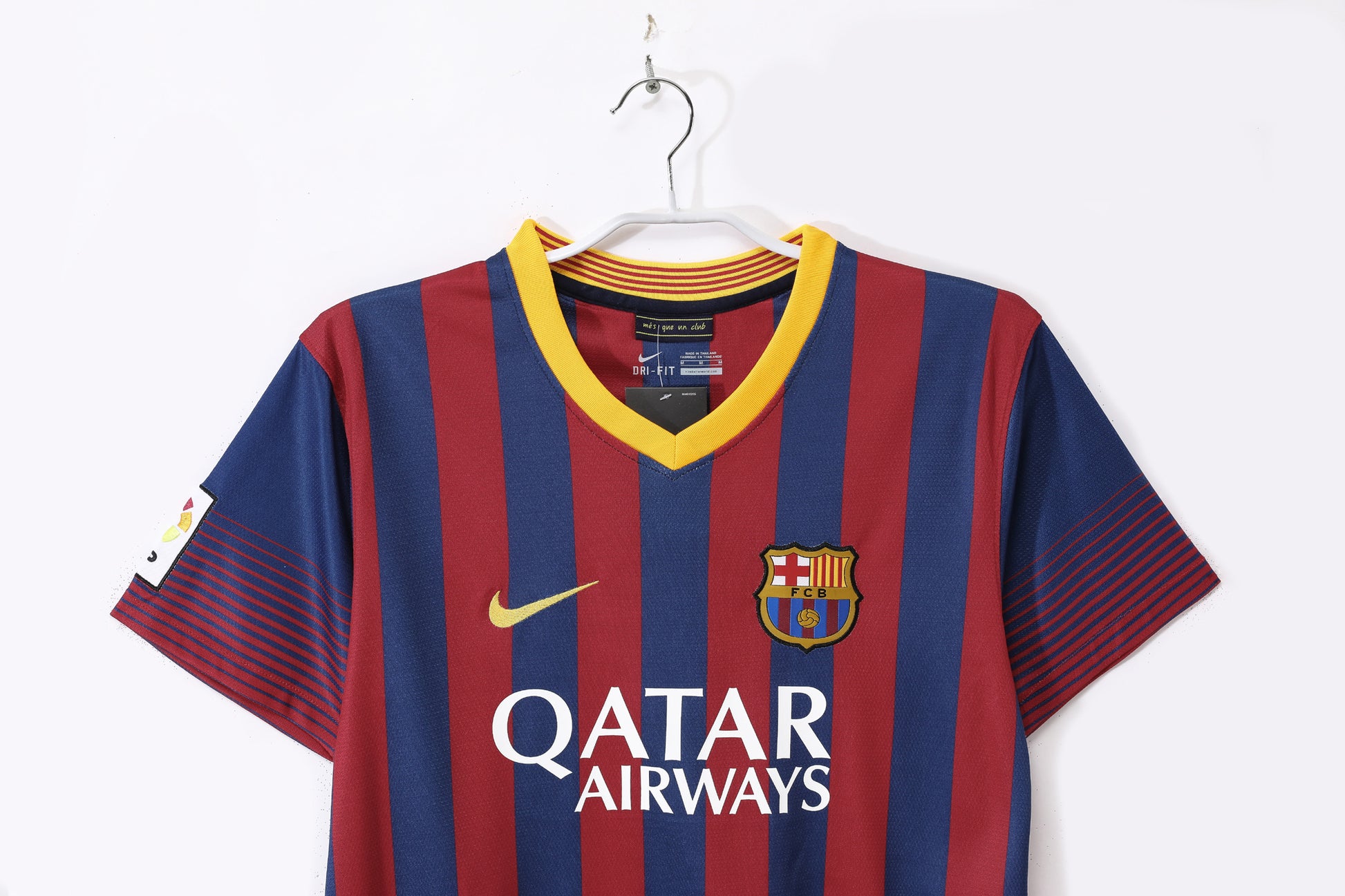 A return to classic thick vertical red-and-blue stripes, trimmed with yellow around the collar. This was worn by Messi, Neymar (in his first season), Xavi, and Iniesta under Tata Martino. The team were La Liga runners-up, lost the Copa final to Real Madrid, and went out in the Champions League quarter-finals, making it a transitional year.