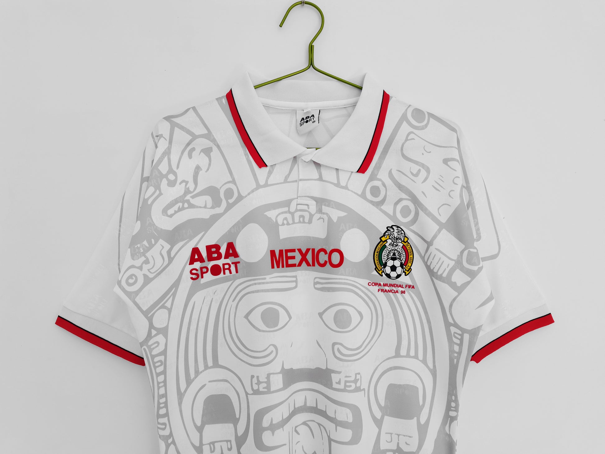 The 1998 away kit features a crisp white base with a bold Aztec-inspired face pattern across the front, accented by green and red trim for a strong Mexican identity. Worn during the 1998 FIFA World Cup in France, this jersey is remembered for its unique cultural design and striking visual impact. Its distinctive look and World Cup history make it a favorite among fans and collectors of Mexico’s most iconic kits.