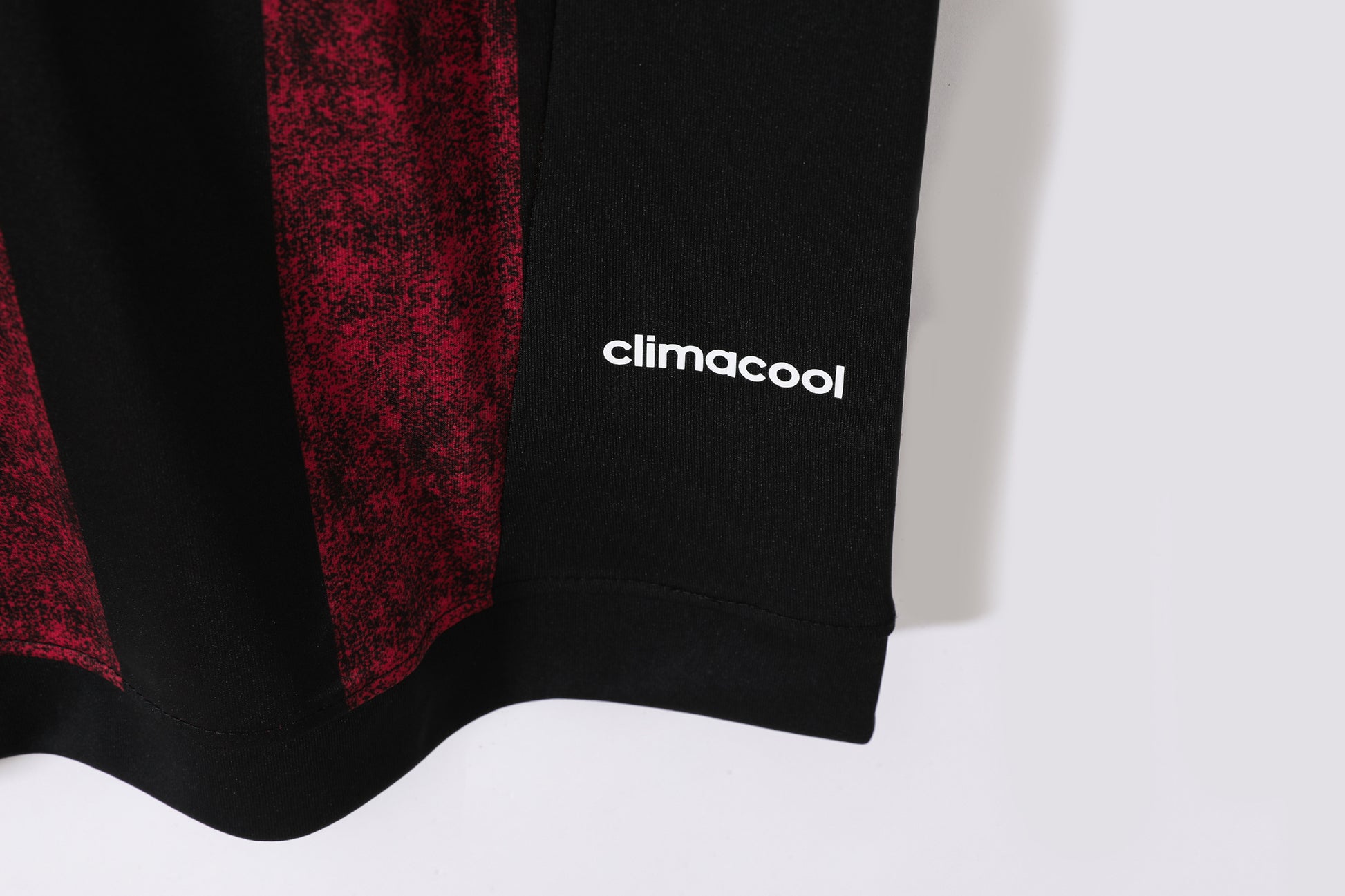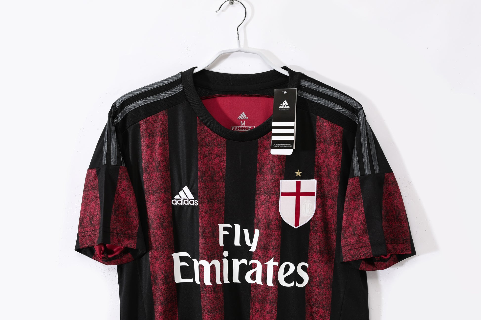 AC Milan’s home jersey for 2015/16 returned to the classic red and black vertical stripes, slightly narrower than previous seasons for a sleeker look. The sleeves were black, and the collar had a simple rounded design with subtle red trim. Puma manufactured the kit, and the Fly Emirates sponsor logo appeared in white across the chest. The shorts were black with minimal red detailing, and the socks were black with a red band at the top. This kit was worn during Serie A, Coppa Italia, and European matches, with Milan finishing 10th in Serie A and reaching the Coppa Italia quarter-finals.