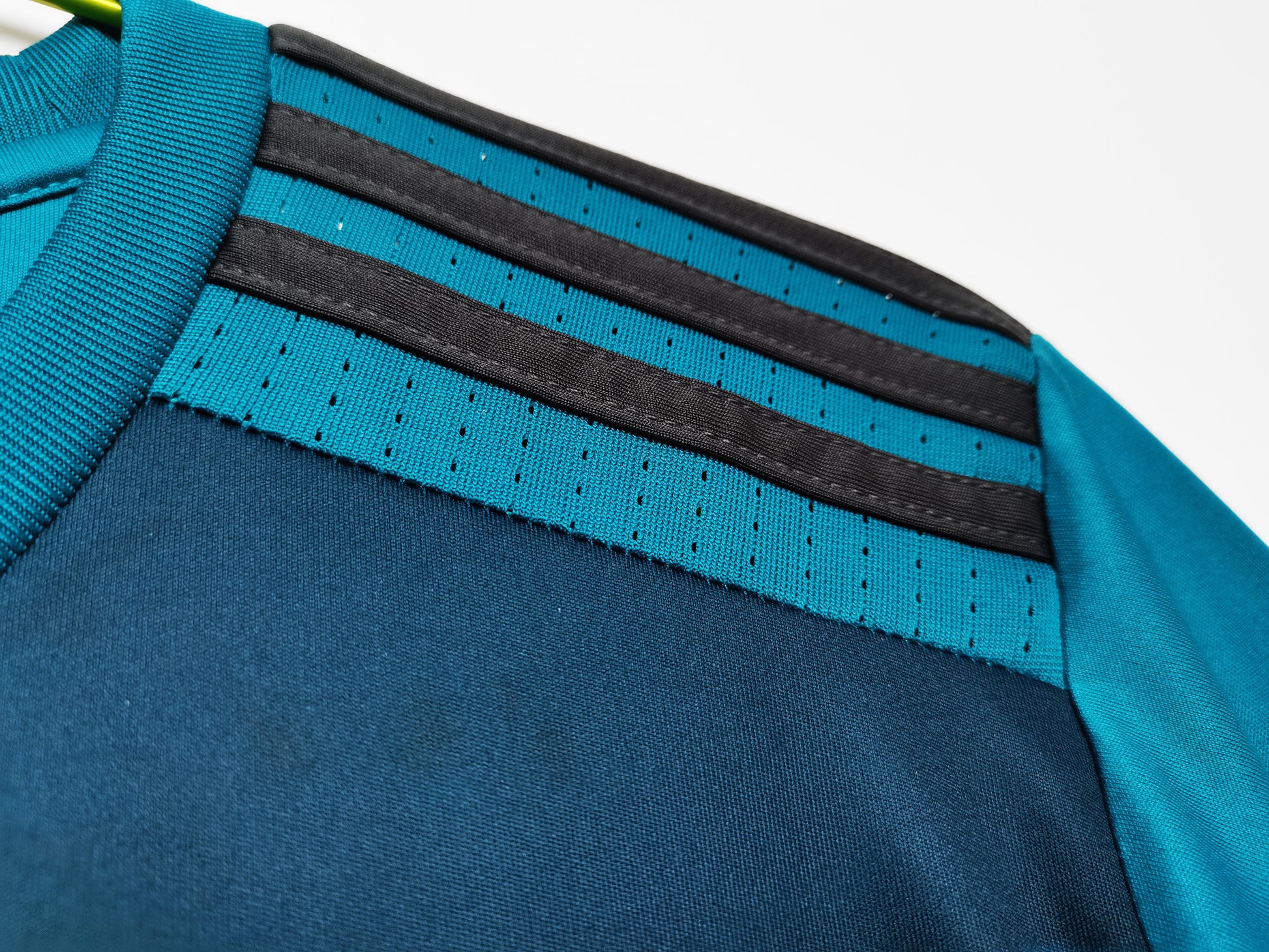 The away shirt was navy with electric blue graphic accents and Adidas stripes, worn by Rodrygo and Valverde, and it was associated with European nights as Madrid sought more continental glory.