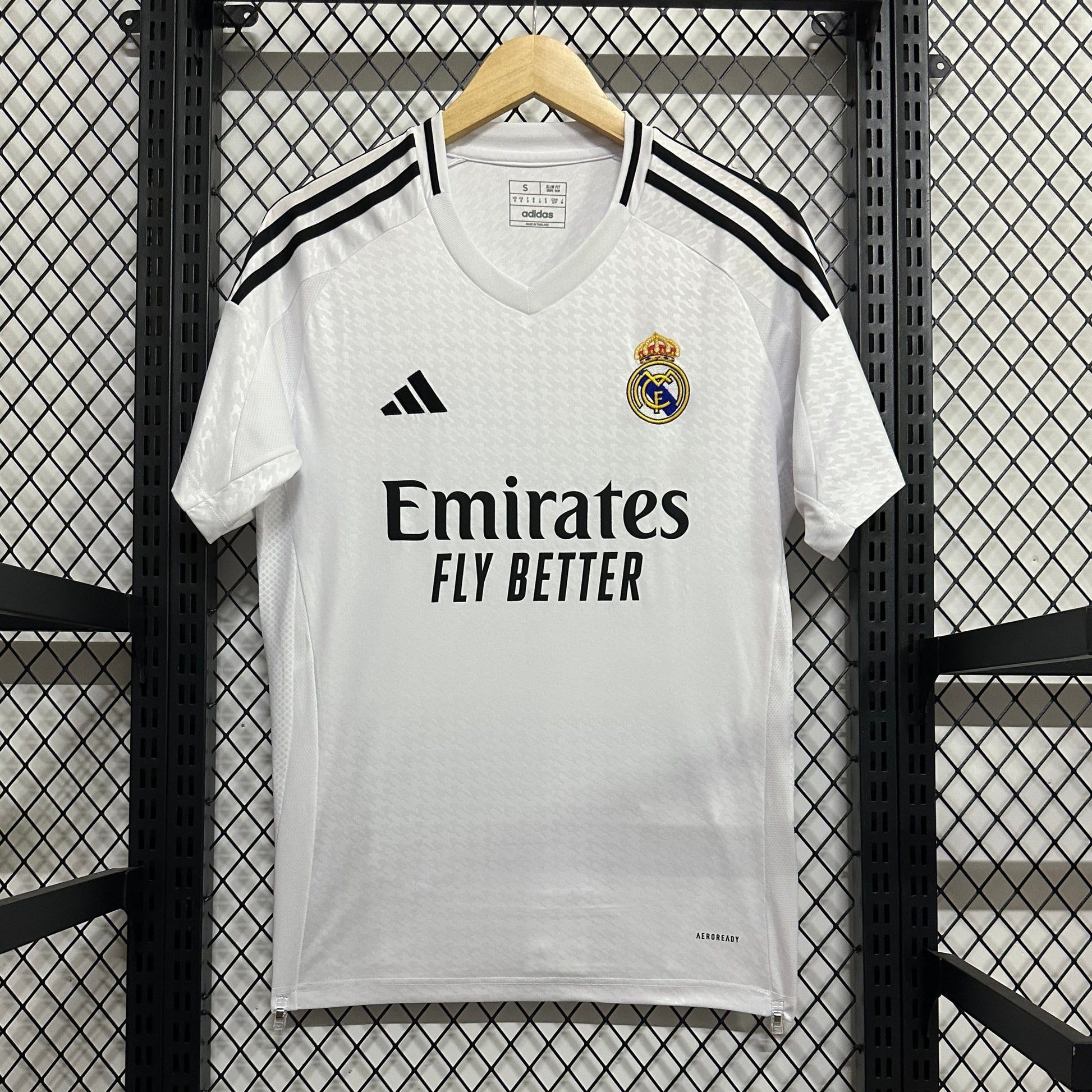The 2024/25 home shirt, Adidas with Emirates Fly Better, kept a traditional white base with black details , worn by Bellingham, Vinícius, and Mbappé, and it was associated with another deep Champions League run and a fierce La Liga title race.