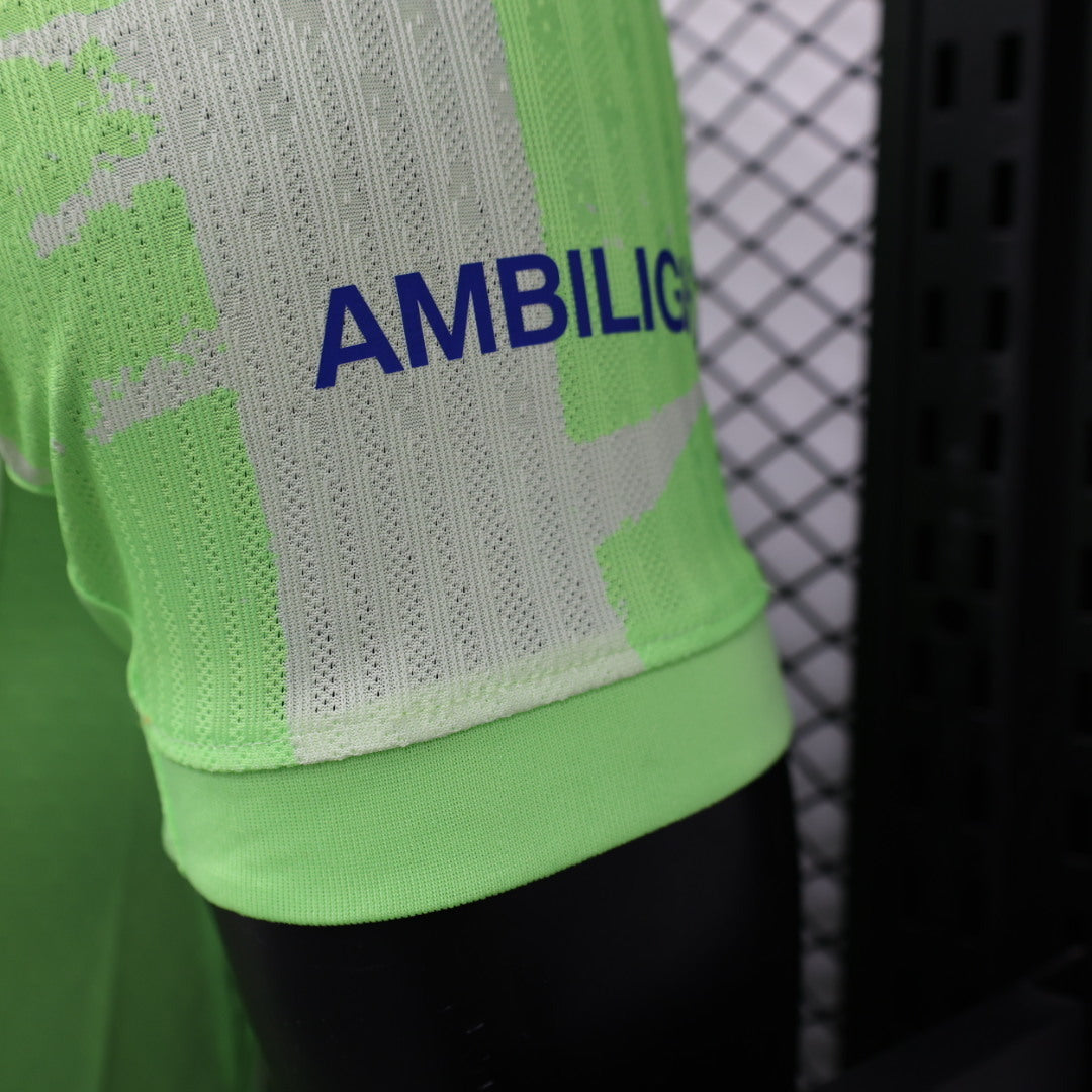 The 2024/25 third kit features a vivid neon green (Barely Volt) base with blue accents and a prominent sponsor logo. Its eye-catching color and modern look make it a popular piece among collectors and fans of contemporary Barça kits.