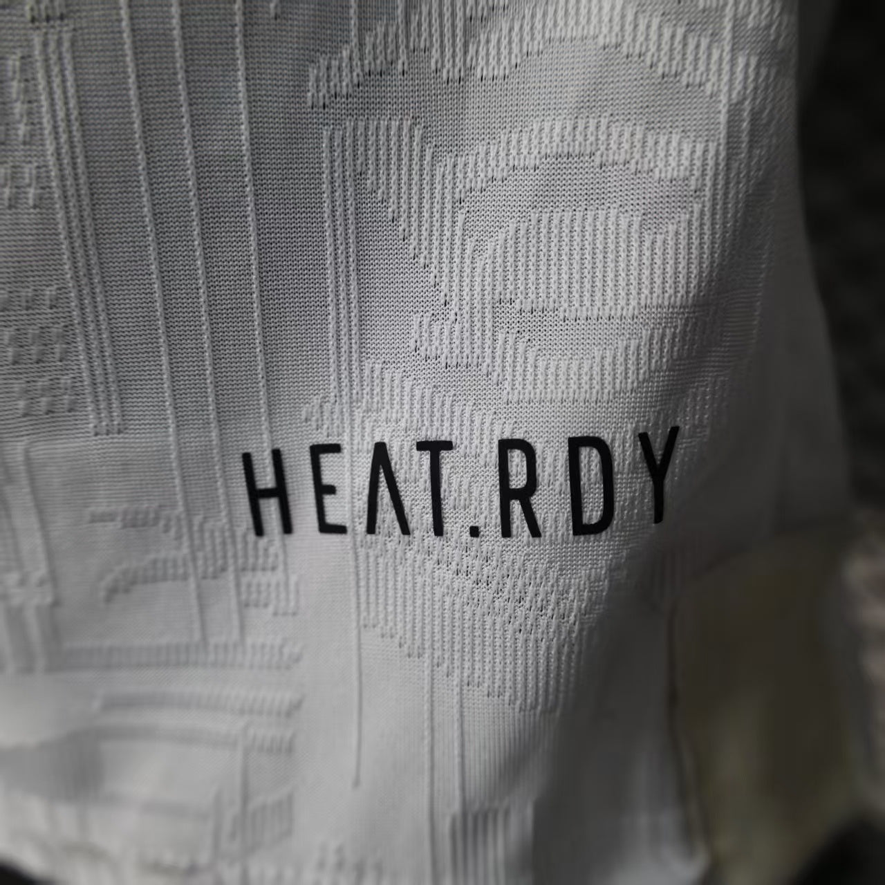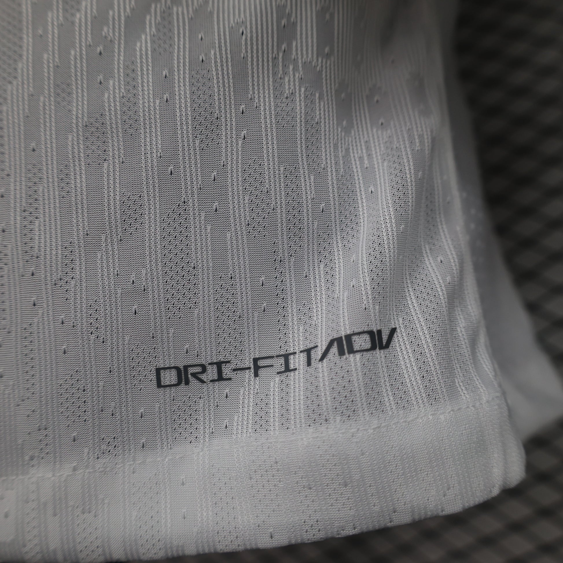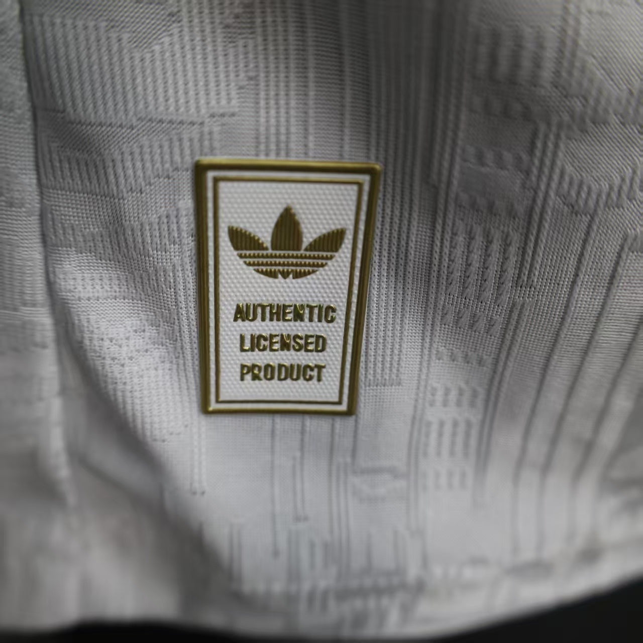 The Arsenal 2025-26 third kit features a clean white (or rather off-white) base that nods to the Art Deco architecture of Highbury’s East Stand. It includes subtle jacquard or tonal graphic details across the shirt, giving texture and visual interest without overwhelming the simplicity of the white. The collar is a classic polo style, edged with maroon and gold striping, and other accents (logos, crest) are also rendered in maroon and gold to match that vintage-inspired look.