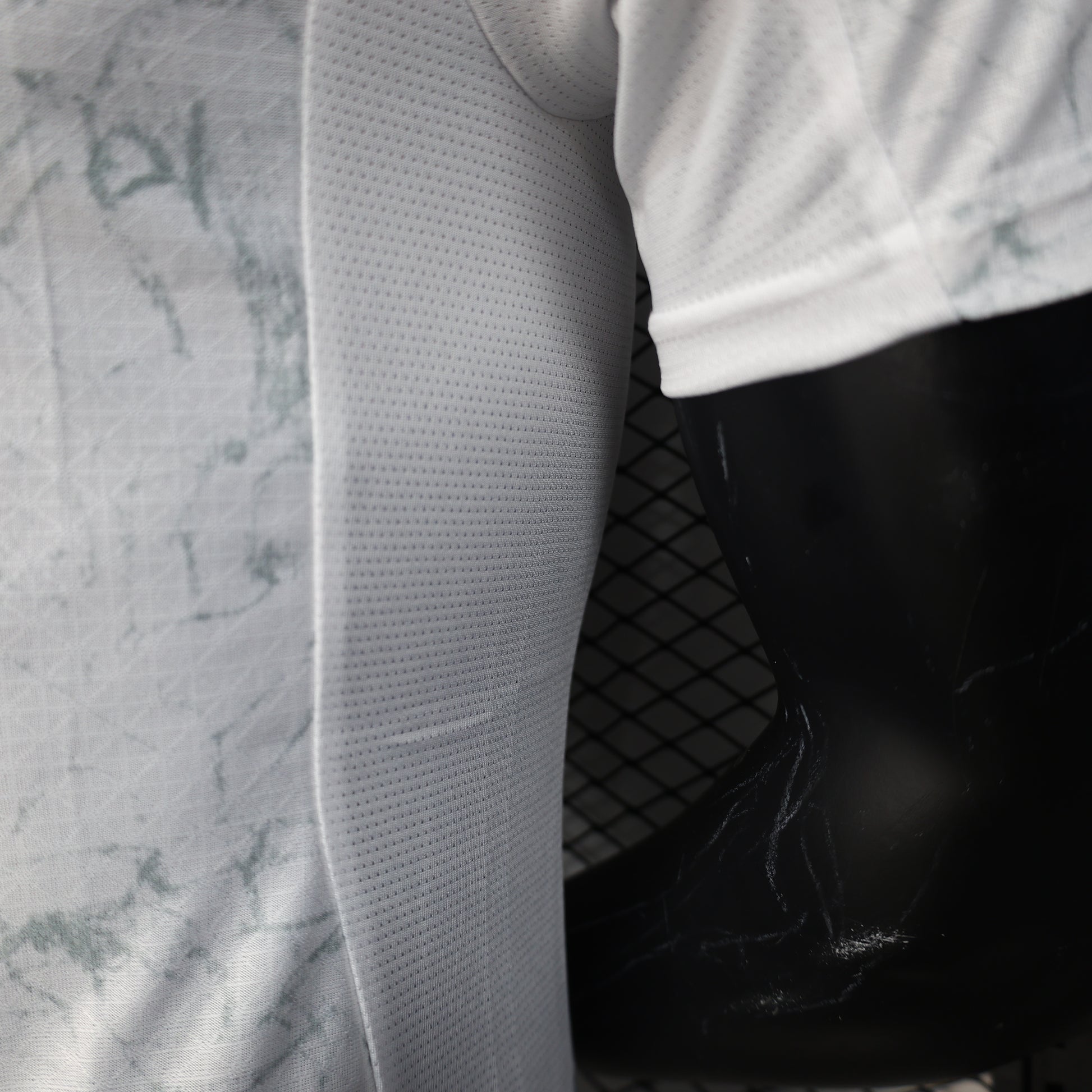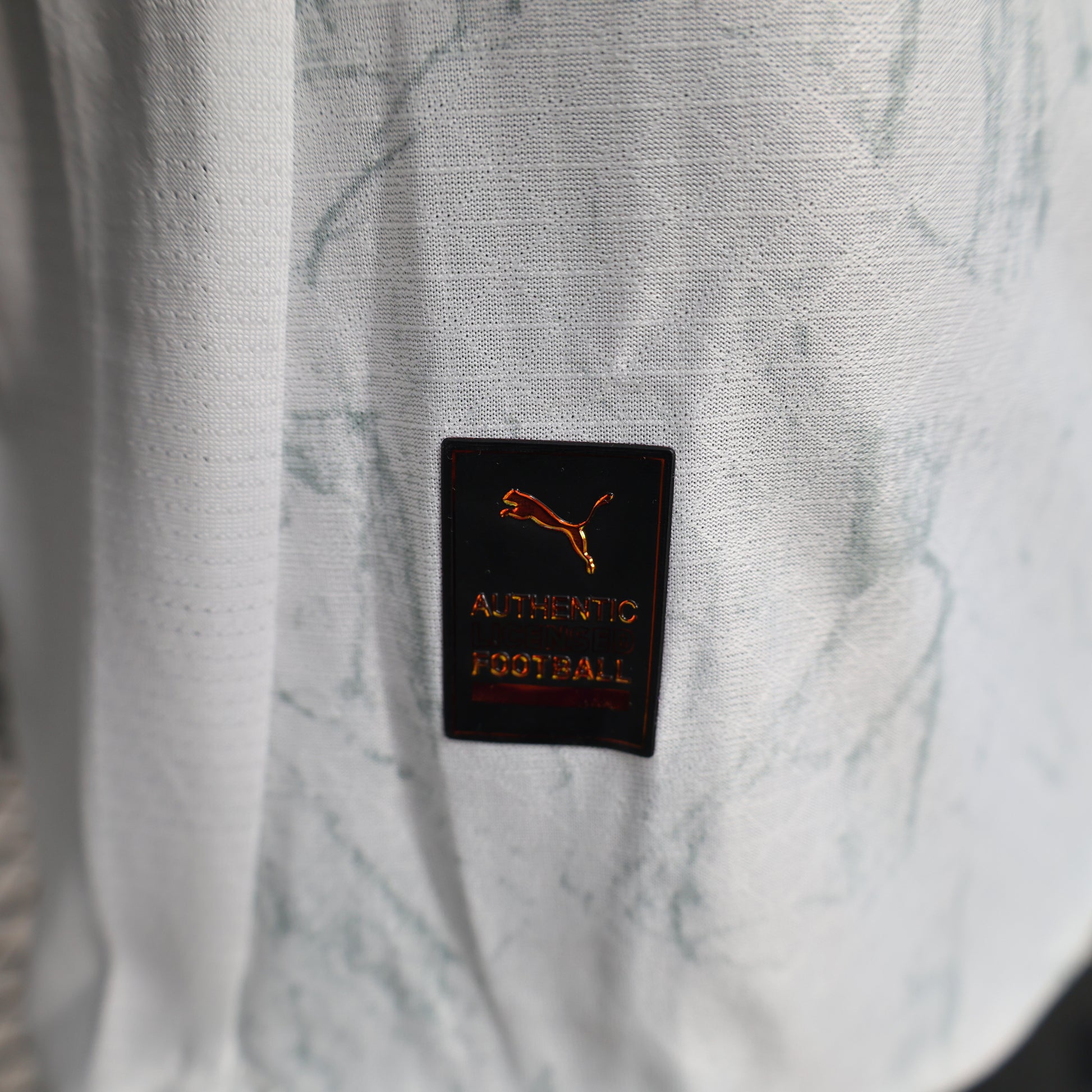 Manchester City’s 2025/26 special edition kit is a striking white design featuring a bold red and black diagonal sash, a clear nod to one of the club’s most iconic looks from the late 2000s. Created in collaboration with Puma and KidSuper for the Club World Cup, the shirt goes beyond simple retro styling with an all-over graphic pattern inspired by the famous “Poznań celebration,” adding texture and uniqueness. The mix of clean white, vibrant sash colors, and creative detailing makes it both a tribute to City tradition and a modern collector’s piece.
