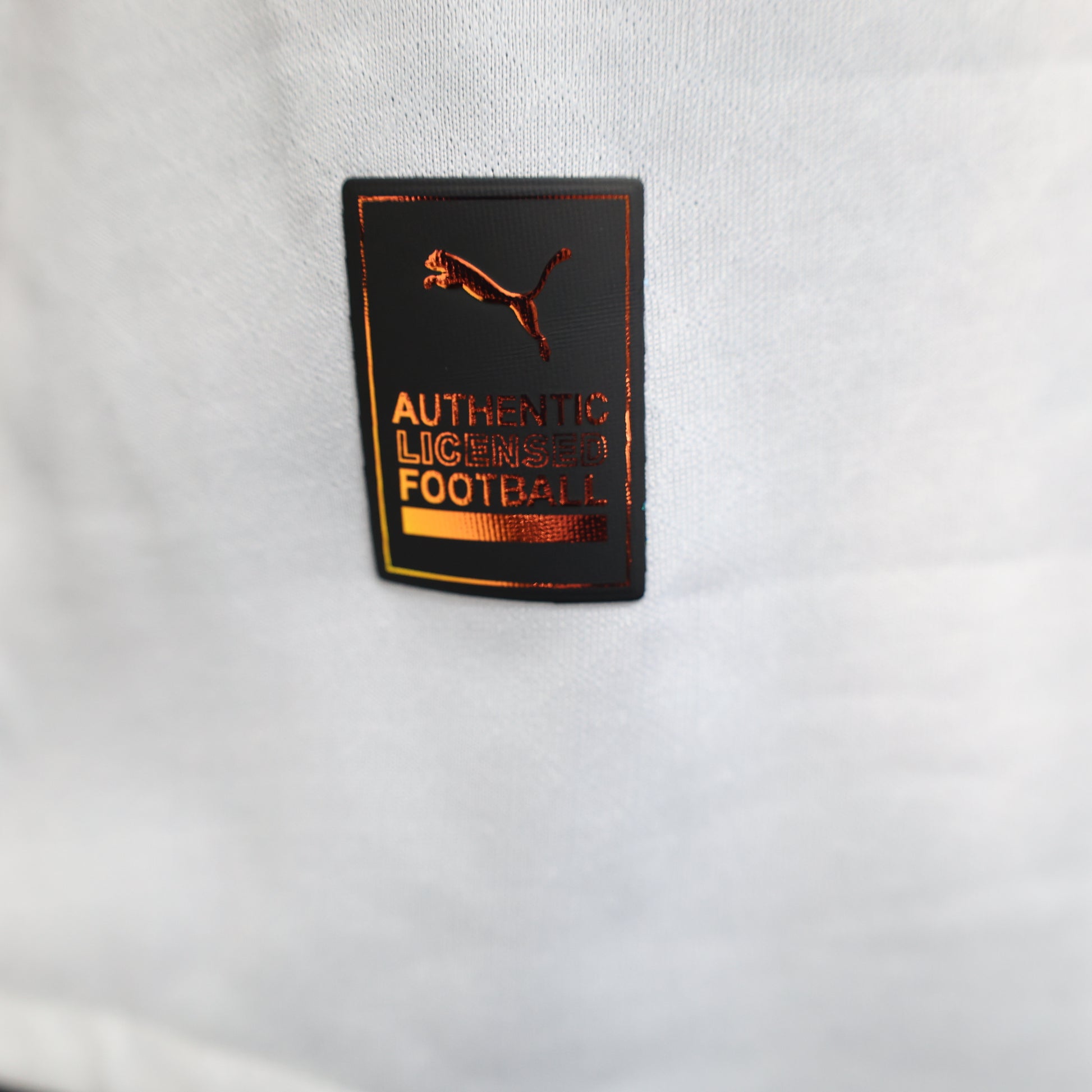 The 2025/26 away kit is predominantly clean white with soft blue details on the collar and sleeves, giving it a sleek and elegant appearance. The Puma logo and club crest are prominently displayed, maintaining consistency with the club’s identity. Like the home kit, it is designed with high-performance materials for comfort, breathability, and optimal performance on the pitch.
