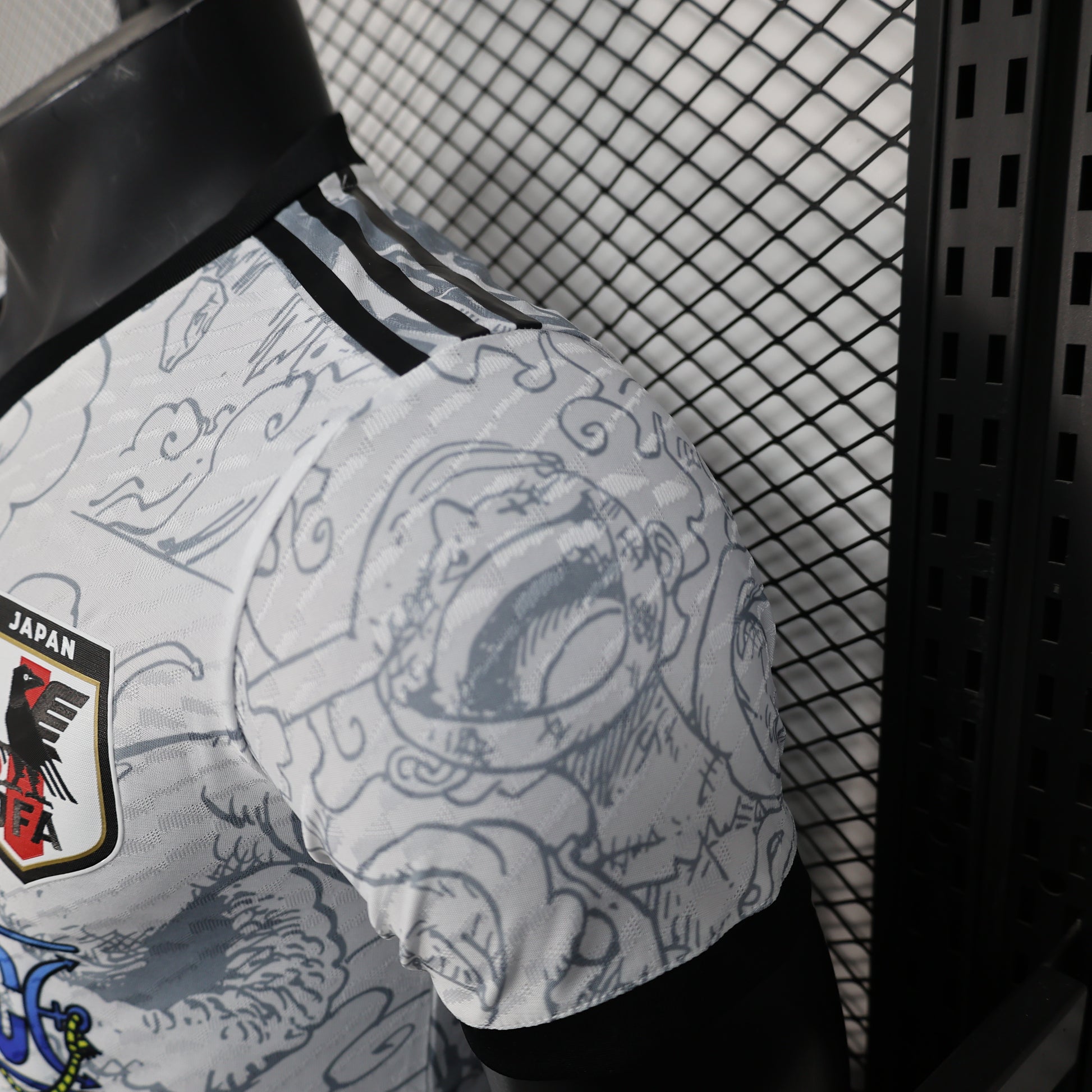 A white-base jersey with a clean, bright background. Across the center of the chest is the “One Piece” title in bold, colorful lettering, making it the focal point. The sleeves and edges can have subtle accents—like light gray or soft pastel tones—to add depth without distracting from the title. The overall design is simple, iconic, and instantly recognizable, perfect for fans of the series.