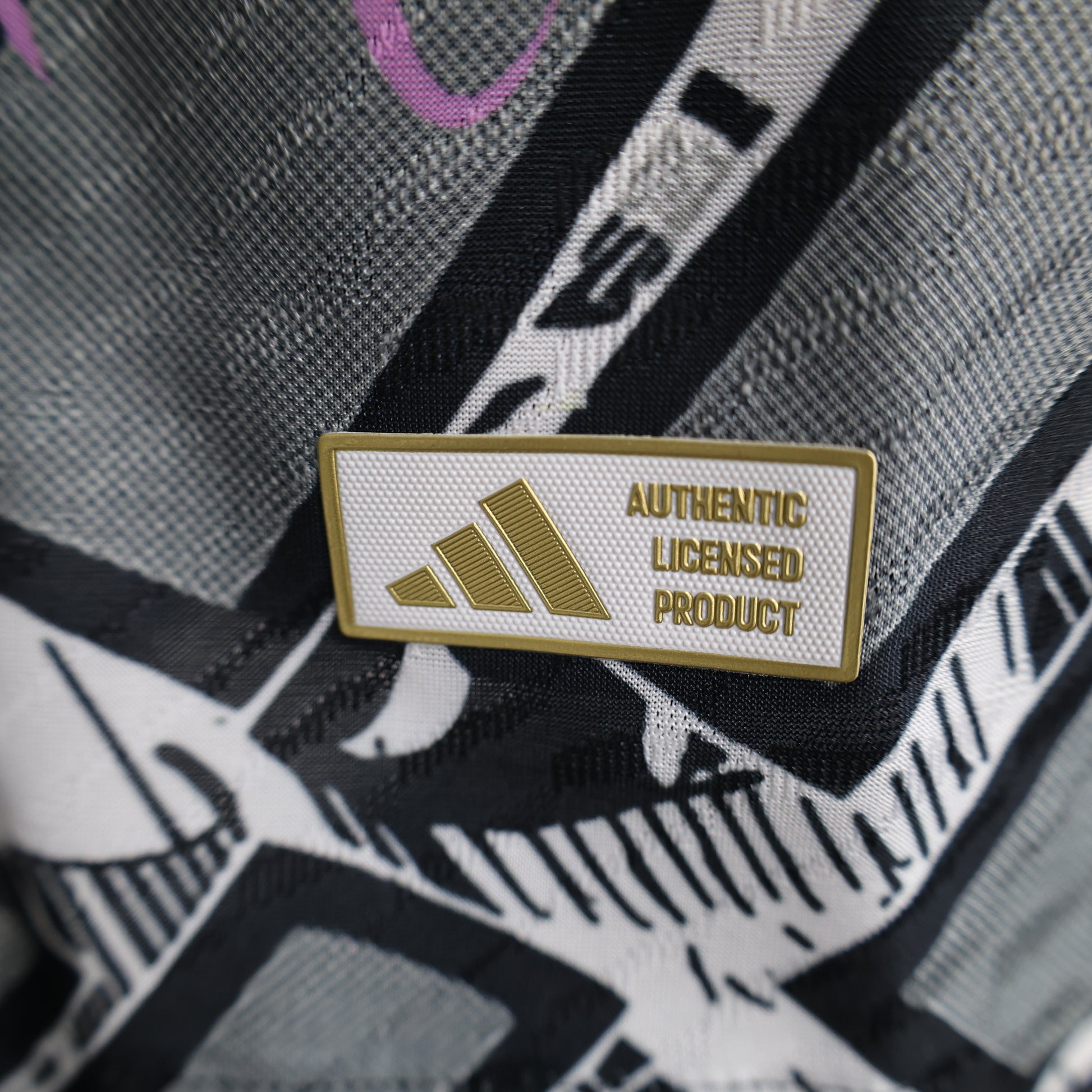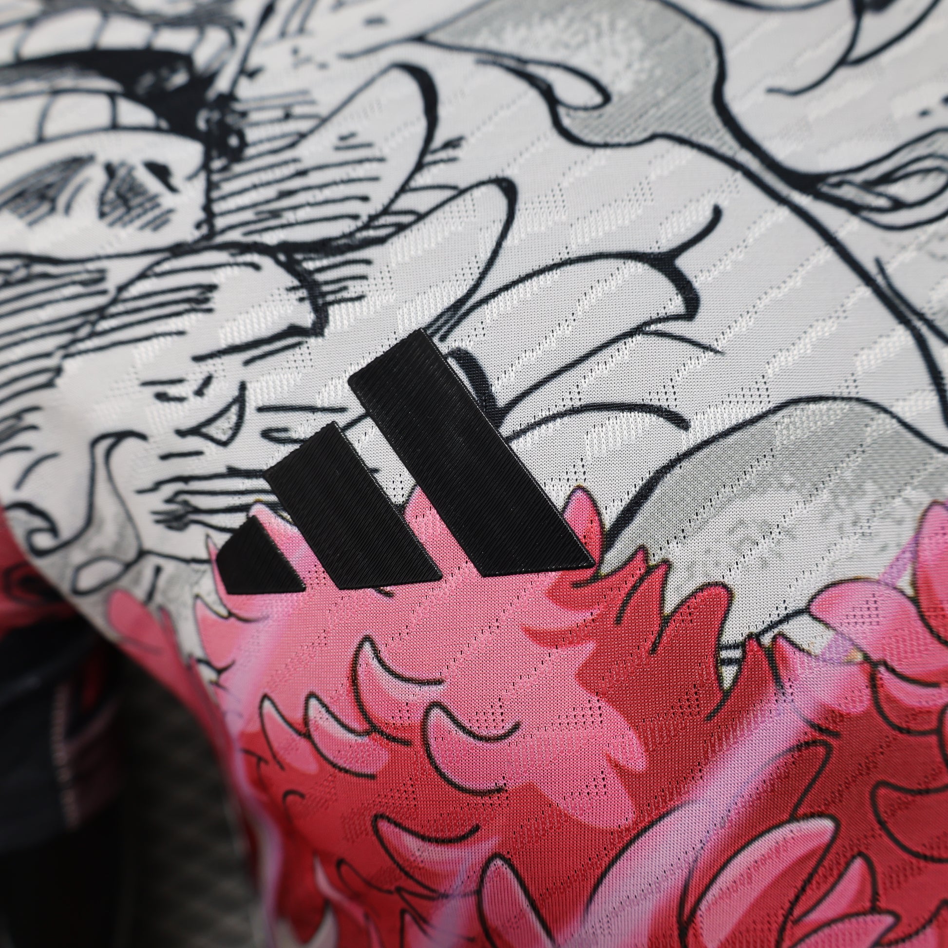 A white-base jersey with Zoro from One Piece featured prominently in the center, wielding his swords in a dynamic pose. The sleeves and sides can have subtle green and black accents to complement Zoro’s outfit and swords. The design is clean yet bold, letting the white background make Zoro stand out as the focal point, while maintaining an energetic and adventurous feel.