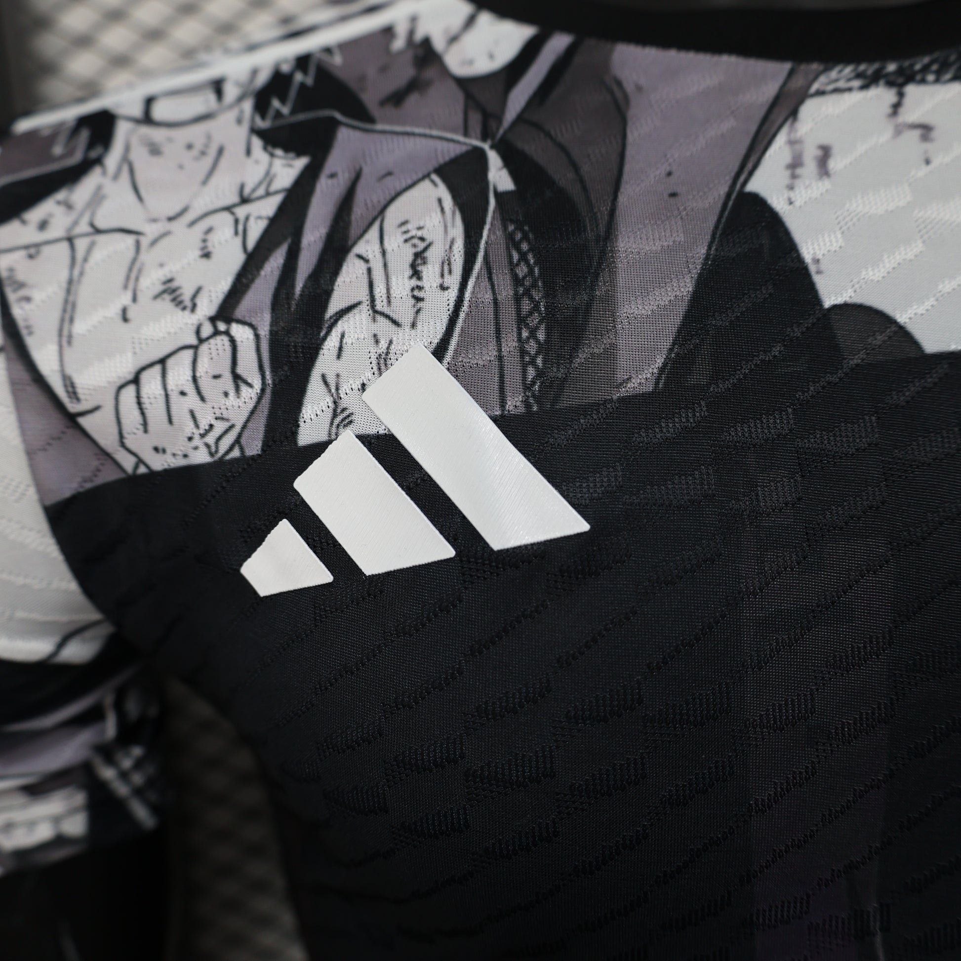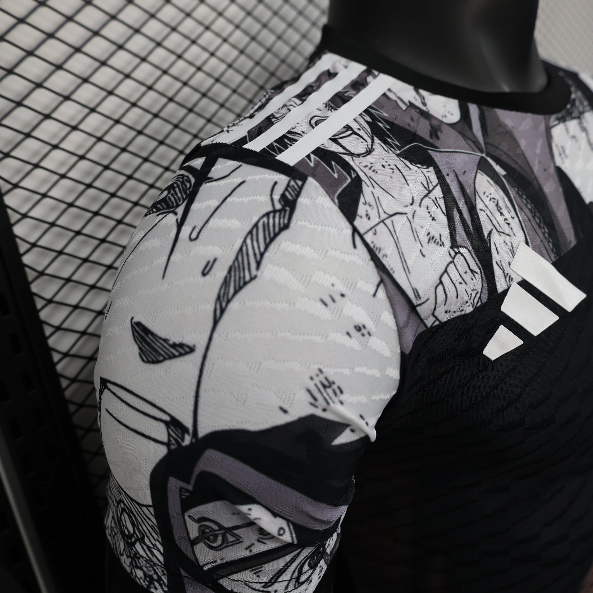 A white, grey, and black base jersey with a sleek, modern gradient or panel design blending the three colors. Several Naruto characters are featured across the front in dynamic poses, such as Sasuke, Sakura, Kakashi, or others, each highlighted with subtle color accents to make them stand out against the neutral base. The sleeves or collar can include minimalist line details in grey or black to tie the design together. The overall look is edgy, stylish, and action-packed, giving a strong Naruto universe vibe without featuring the main character.