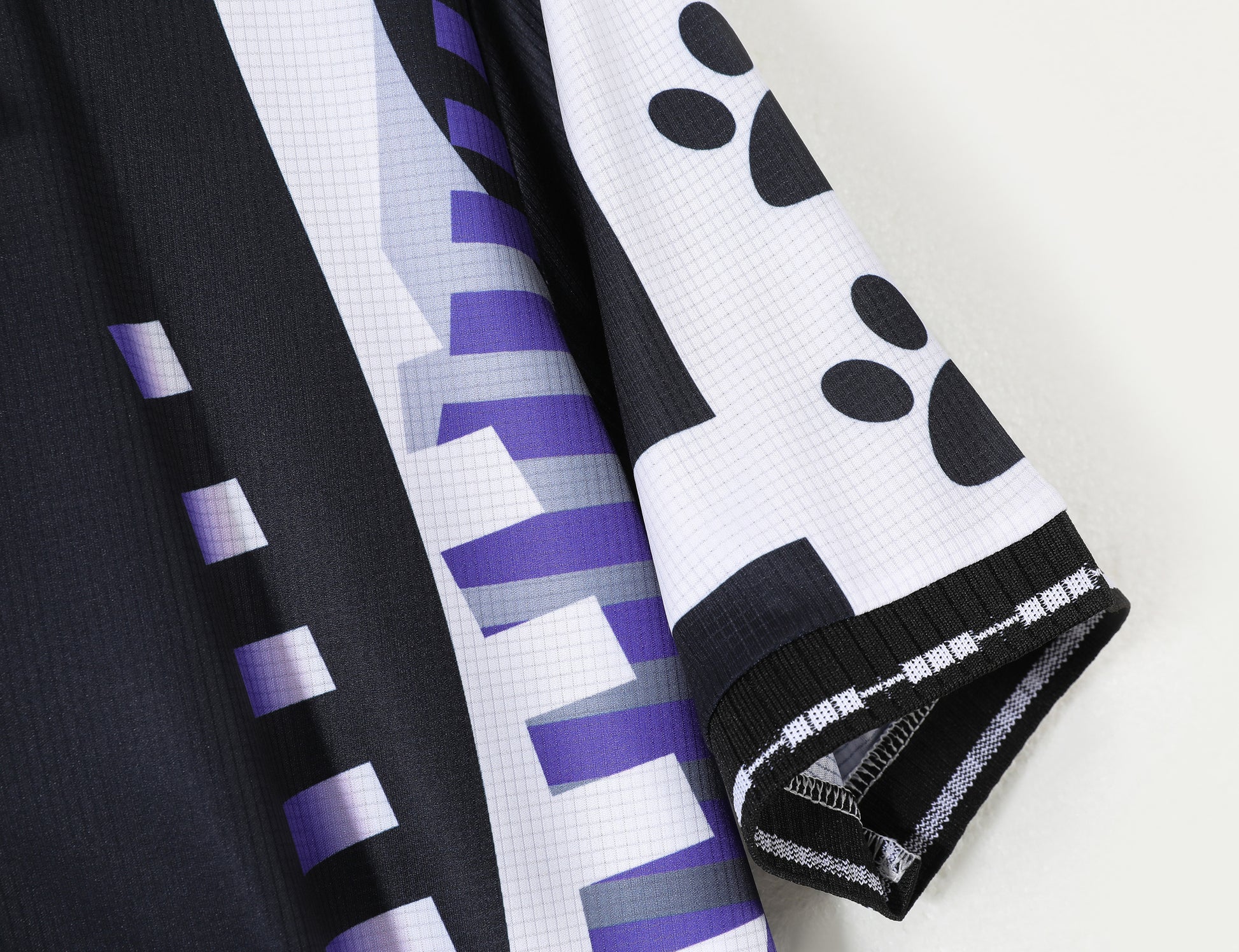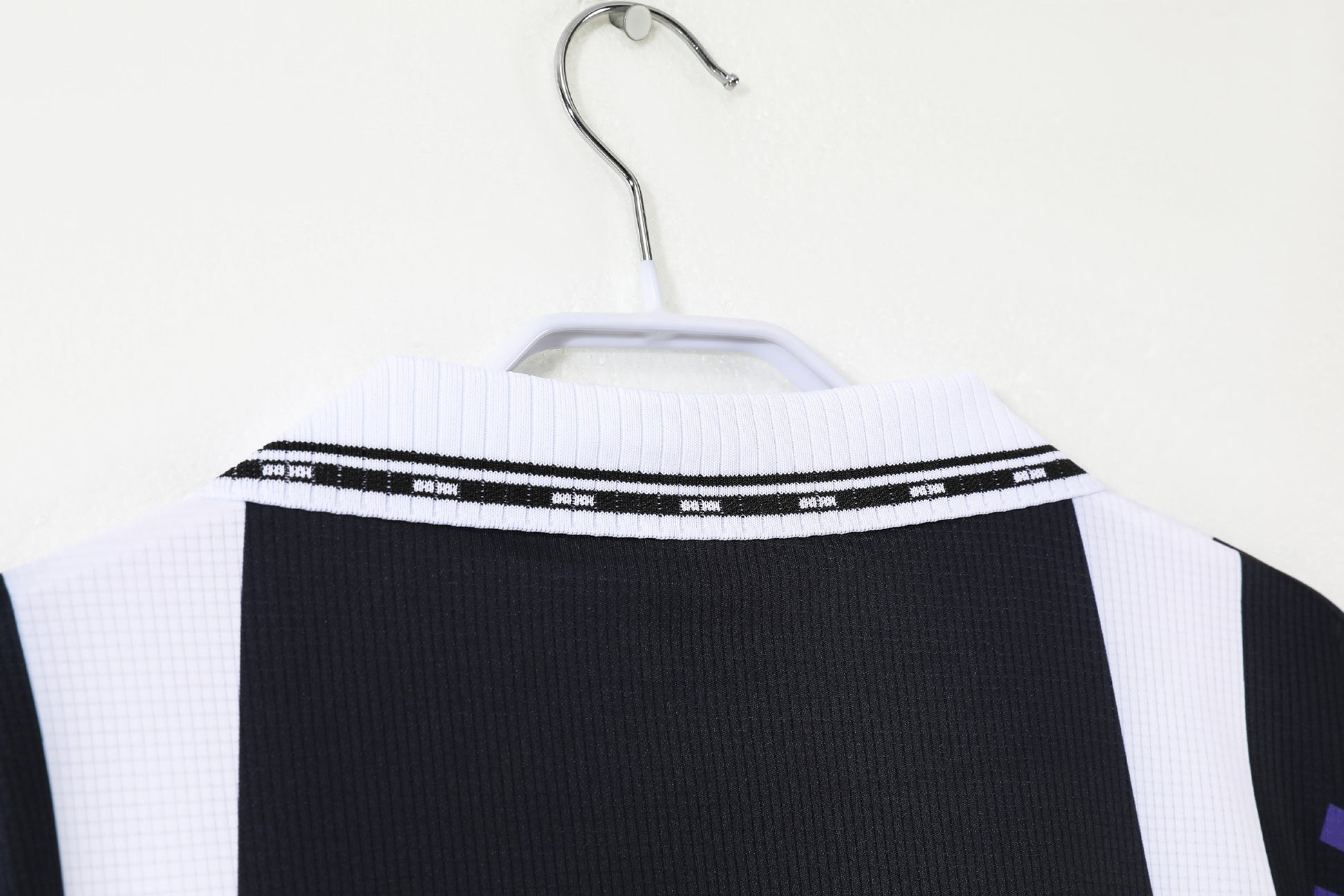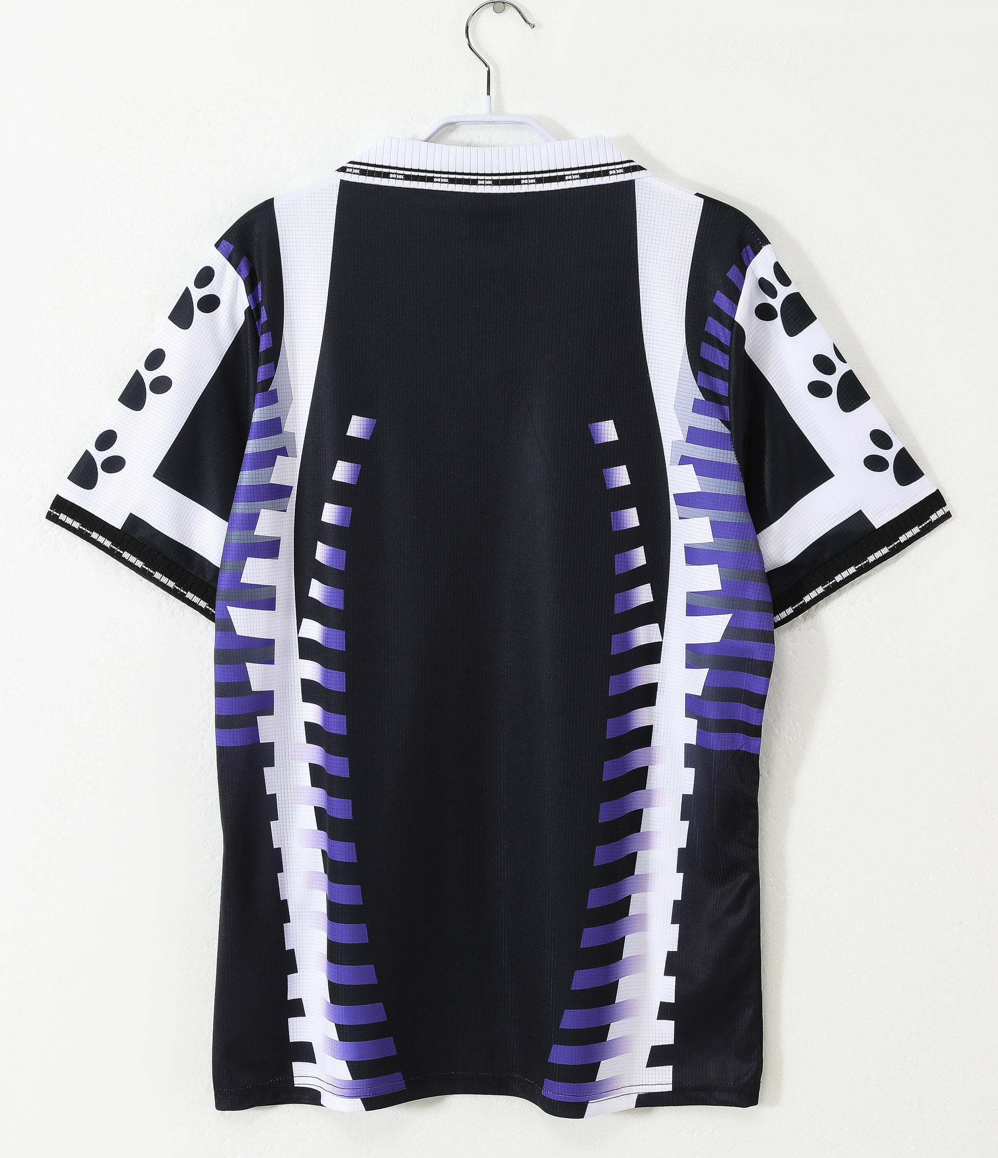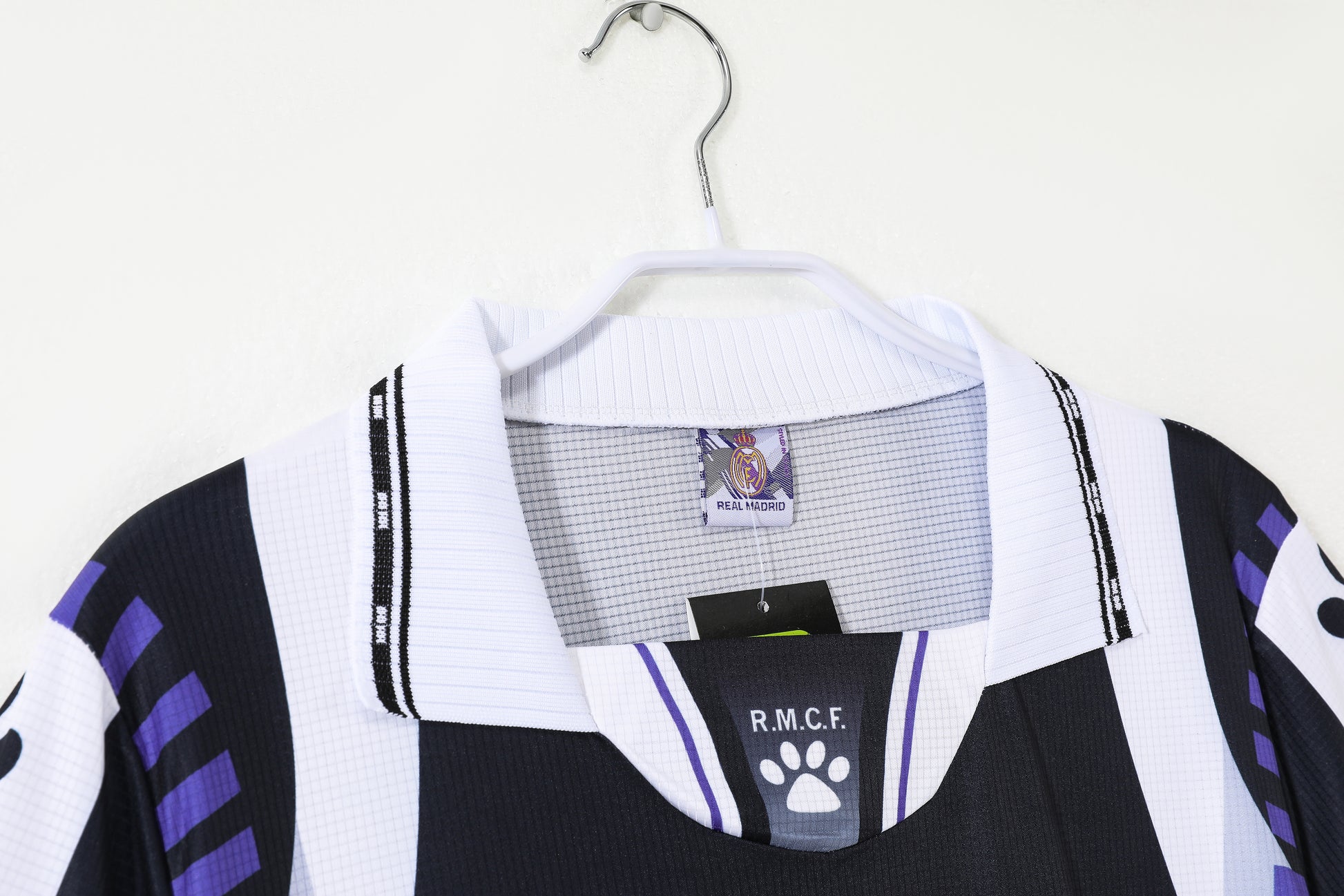 This is the Real Madrid 1996/97 away jersey, designed by Kelme and sponsored by Teka. The shirt stands out with its bold black base, broken up by striking white and purple geometric claw-like patterns along the front and sides, a hallmark of Kelme’s adventurous mid-90s style. The club crest and Kelme paw logo sit centrally above the large Teka sponsor, while the collar features a classic white fold-over design. This kit was worn by stars such as Raúl, Davor Šuker, Roberto Carlos, Fernando Hierro, and Clarence Seedorf during Fabio Capello’s one-season stint as coach, in which Real Madrid reclaimed the La Liga title, finishing ahead of Barcelona.